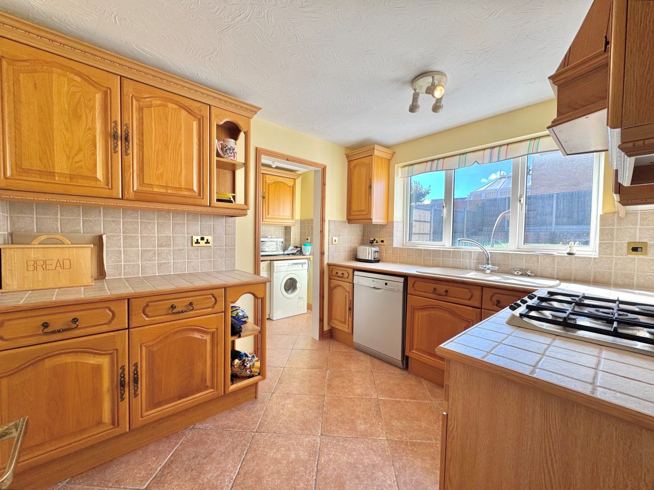 Window to rear, door to the entrance hall and a range of eye and base level units with roll top work surfaces and tiled splash backs. There is a one and a half sink drainer unit, an integrated oven, grill and a five ring gas hob with an extractor fan hood, plumbing for a dish washer, tiled floor and a door way to: