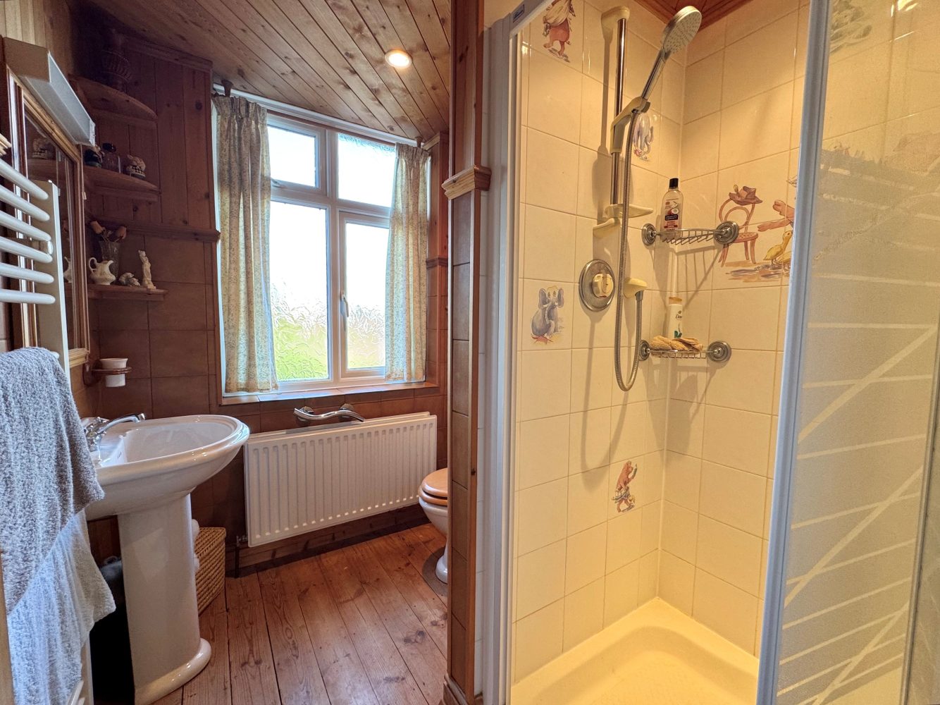 Frosted window to front and a three piece suite to comprise: Low flush WC, pedestal wash hand basin with a vanity light and shaver points and an independent shower cubicle, tiled splash backs, heated towel rail, wooden floor and an extractor fan.
