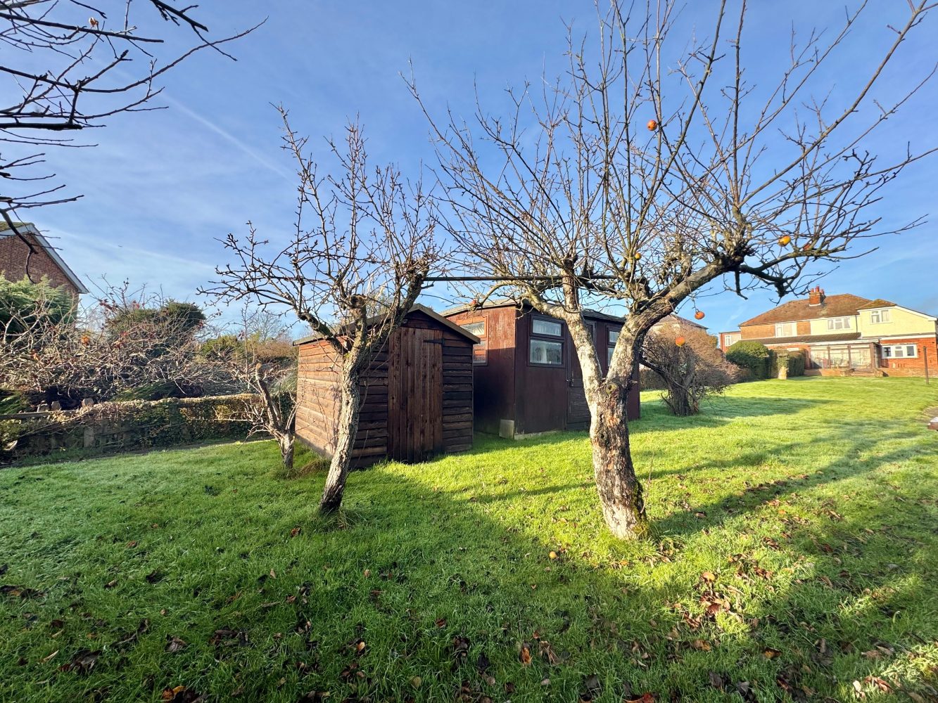 A generous sized garden which is mainly laid to lawn with mature hedging and fruit trees, there are two wooden sheds and a raised patio area with an outside tap and courtesy lighting.