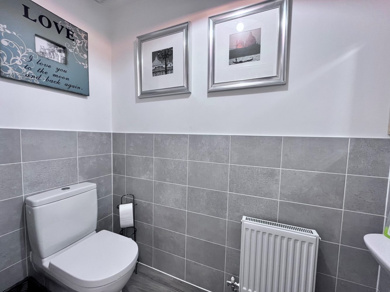 A white suite to comprise: Low flush WC and a pedestal wash hand basin with half height contemporary wall tiling splash backs, Amtico flooring and an extractor fan.