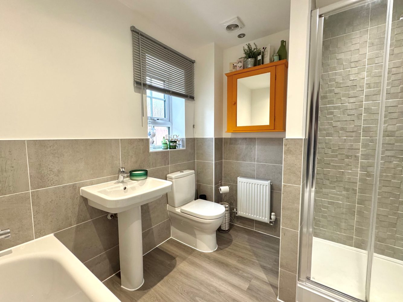 Frosted window to rear and a four piece suite to comprise: Low flush WC, pedestal wash hand basin, panelled bath with a shower hose attached and tiled splash backs, and there is an independent shower cubicle with full wall height contemporary wall tiling, ceiling down lights, Amtico flooring and an extractor fan.