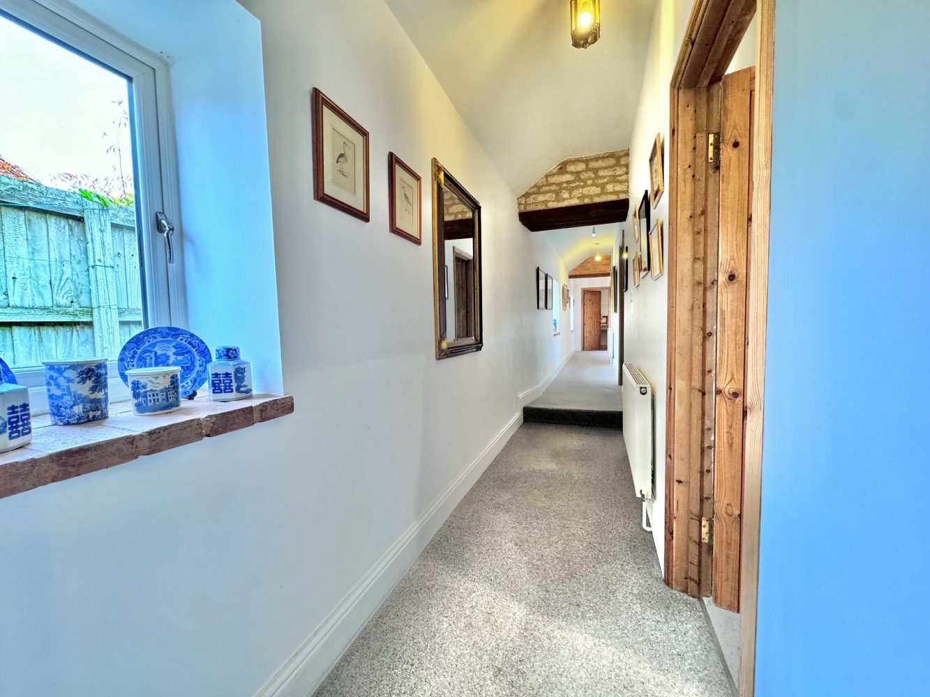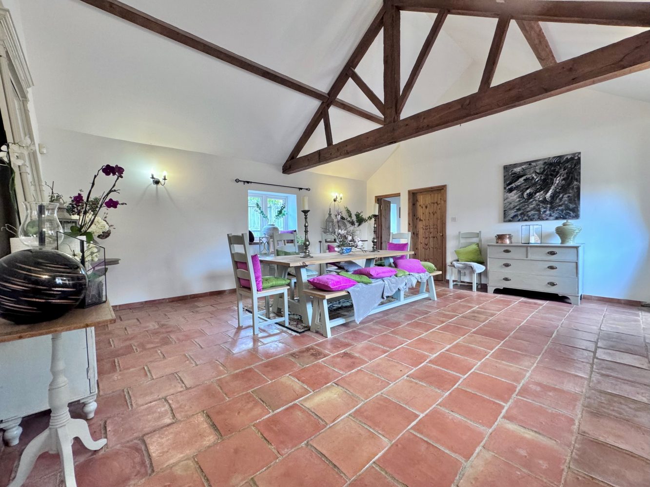 Also a generous sized and double aspect room with a window to side, a window and a part glazed door to front and a vaulted beamed ceiling with terracotta tiled floor, panelled door to the inner hall and a panelled door to: