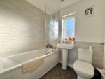 Frosted window to rear, ceiling down lights and a white suite to comprise: Low flush WC, pedestal wash hand basin and an independent shower cubicle, tiled splash backs, shaver points, heated towel rail and an extractor fan.