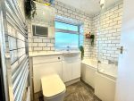 Frosted window to rear and a white suite to comprise: Low flush WC, vanity unit wash hand basin and a 'P' shaped bath with an independent shower and screen above, fully tiled walls, heated towel rail, ceiling down lights and an extractor fan.