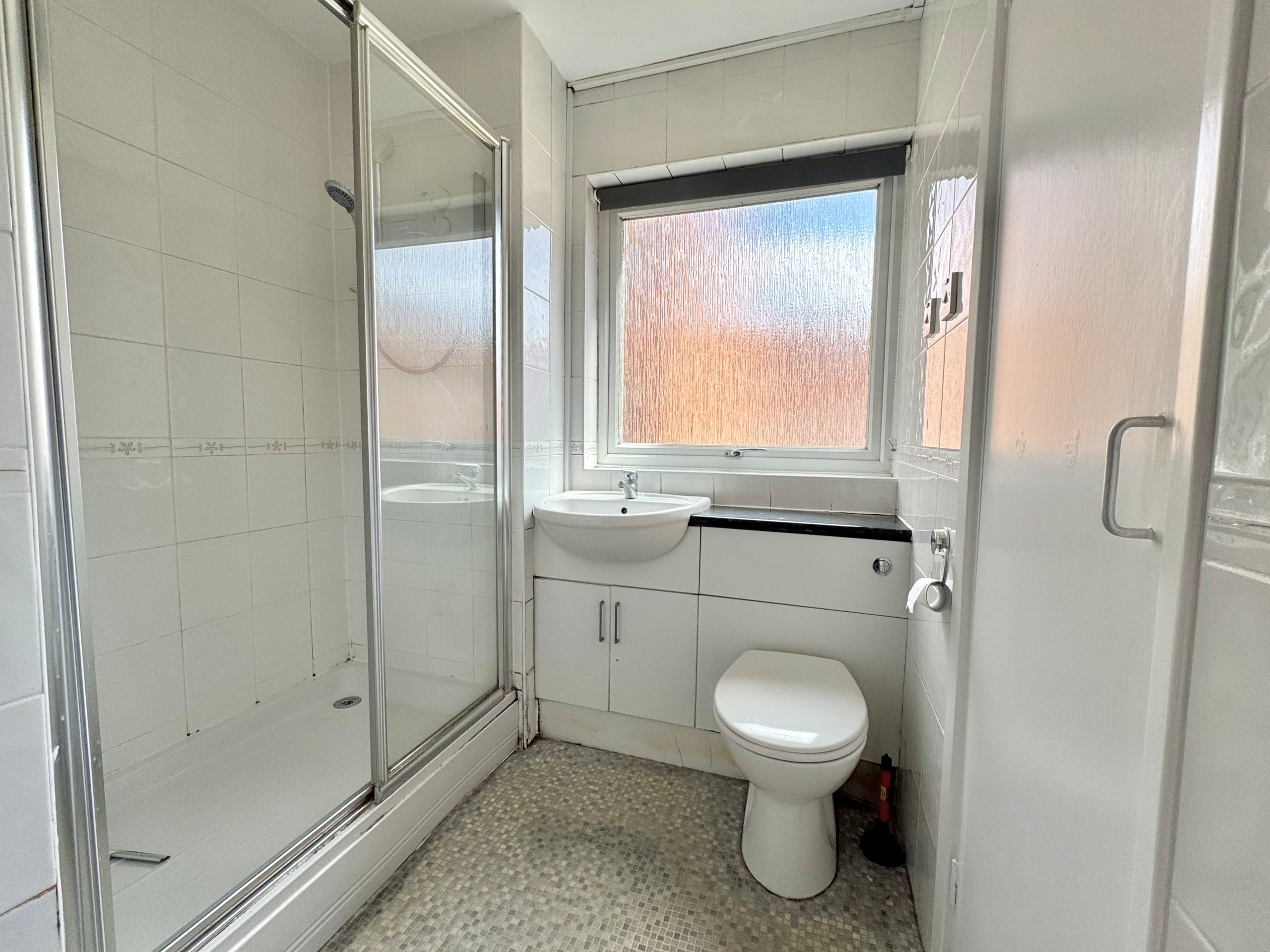 Frosted window to front and there is white suite to comprise: Low flush WC, vanity unit wash hand basin with a counter top and an independent double shower cubicle, fully tiled walls, wall mounted heater and a built-in airing cupboard which houses the hot water cylinder.
