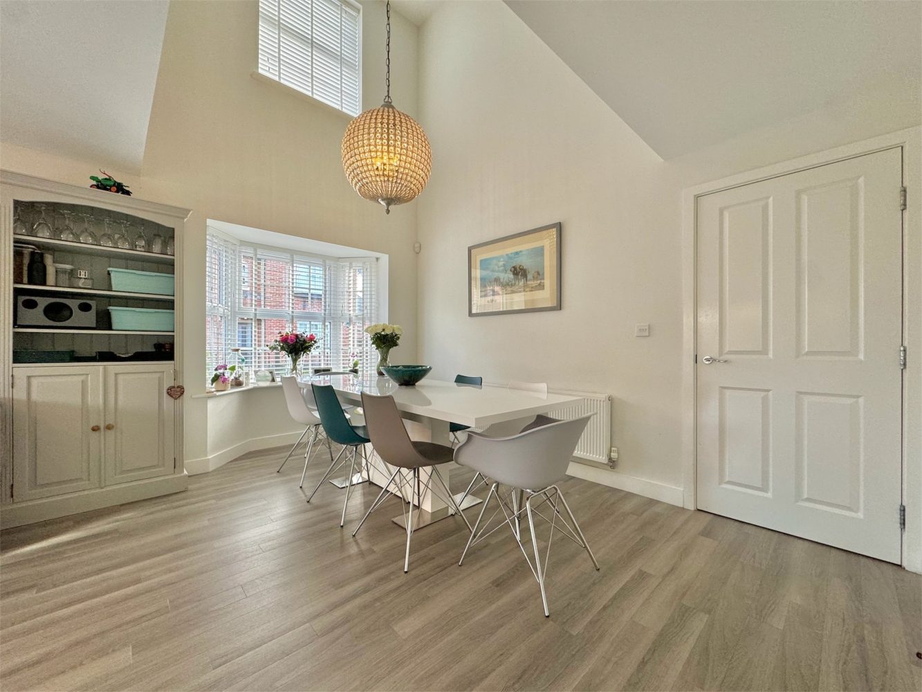 An impressive dual aspect room which has a vaulted ceiling, glazed bi-folding doors to rear, a window to side as well as a walk-in bay window to side and a range of eye and base level units with a breakfast bar, Quartz work tops, splash backs and concealed lighting. There is a one and a half sink drainer unit, an integrated double oven, grill and a five ring gas hob with a stainless steel extractor fan hood, integrated fridge freezer, integrated dish washer, ceiling down lights and a door to: