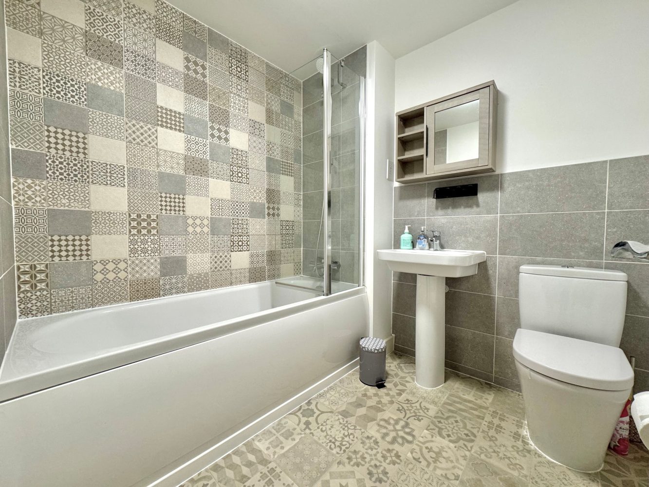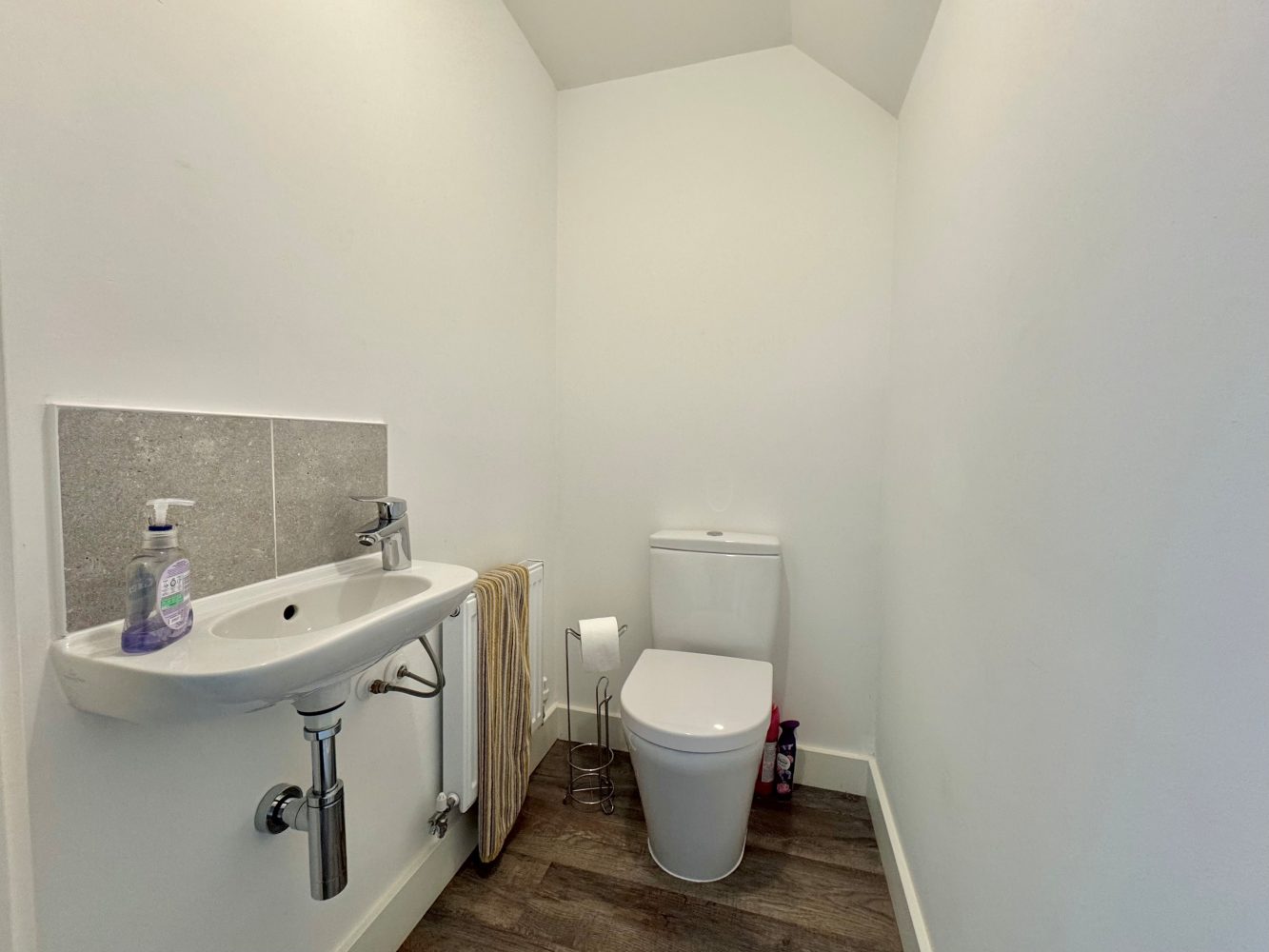 A white suite to comprise: Low flush WC, pedestal wash hand basin and a paneled bath with an independent shower and screen above, tiled splash backs, heated towel rail and an extractor fan.