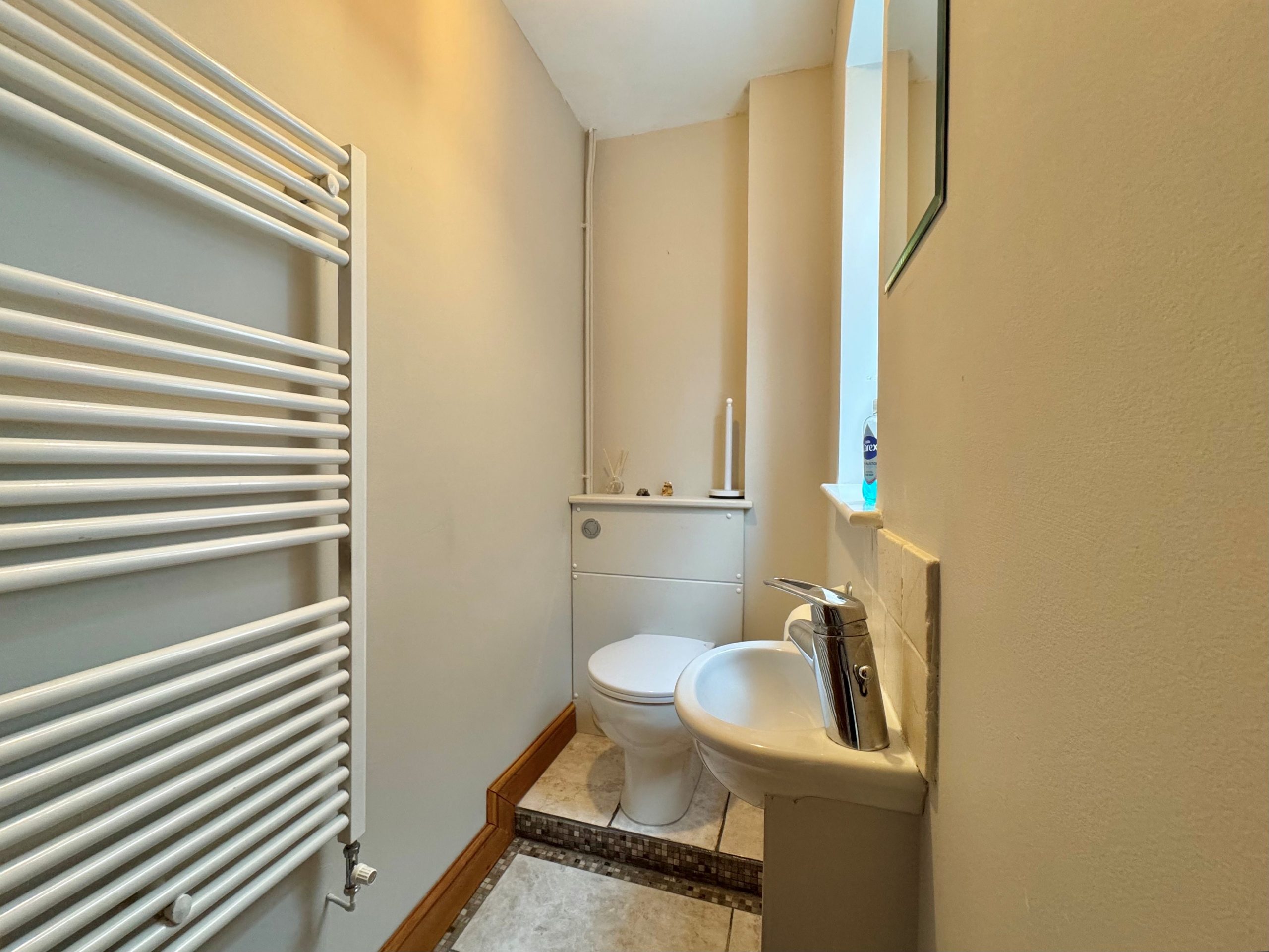 Frosted window to front and a two piece suite to comprise: Low flush WC and a wash hand basin with tiled splash backs and a tiled floor.