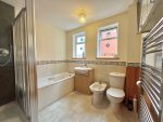 Two frosted windows to side and there is a five piece suite to comprise: Double shower cubicle, low flush WC, vanity unit wash hand basin, bede and and a panelled bath, tiled splash backs, heated towel rail and an extractor fan.