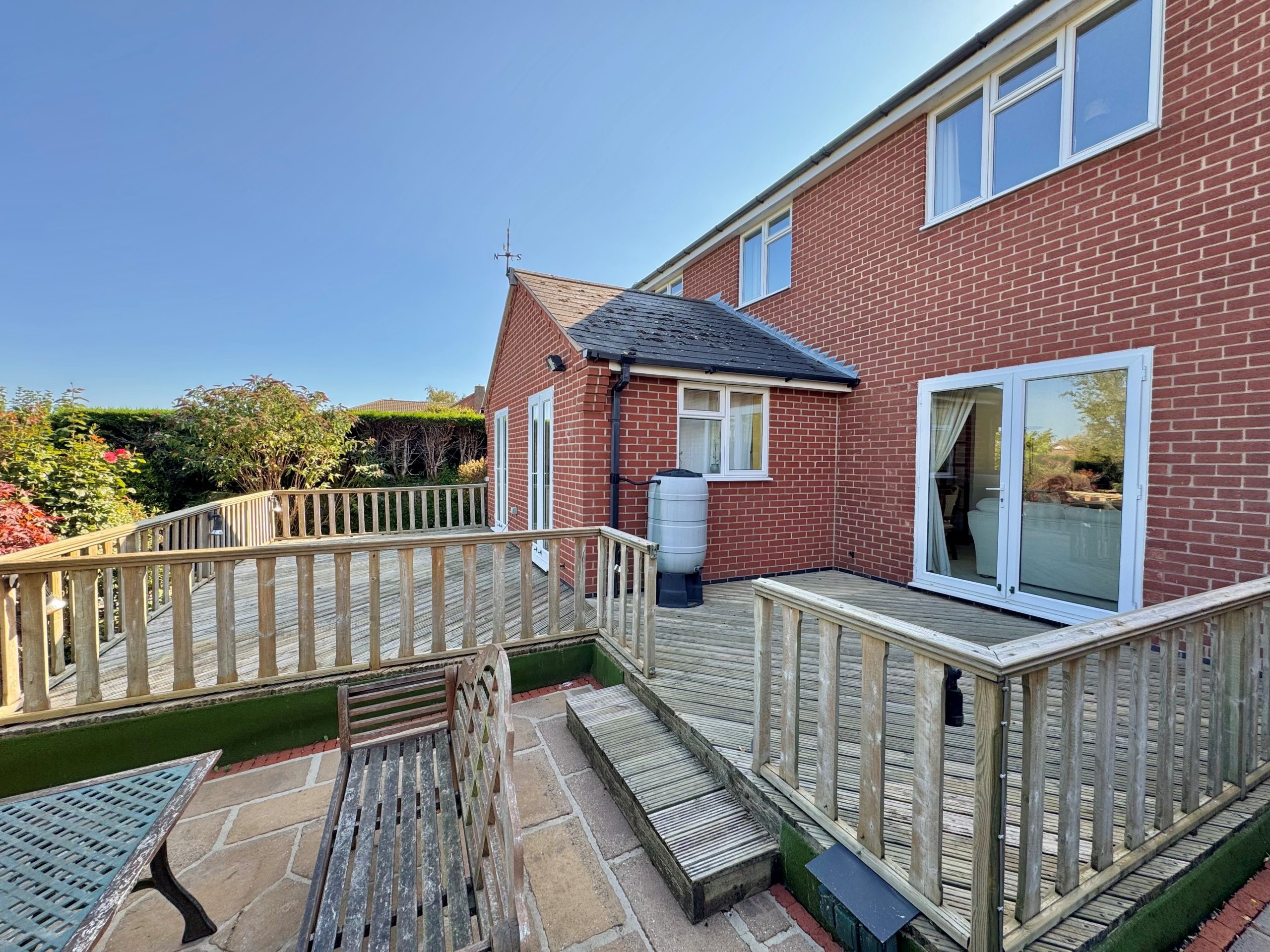 A generous sized and well established garden which is mainly laid to lawn with mature flowers, shrubs, hedging and trees. There are two patio areas, a wooden potting shed and an extensive decked area with courtesy lighting as well as space to one side of the property offering access to the double garage with courtesy lighting and an outside tap.