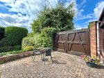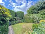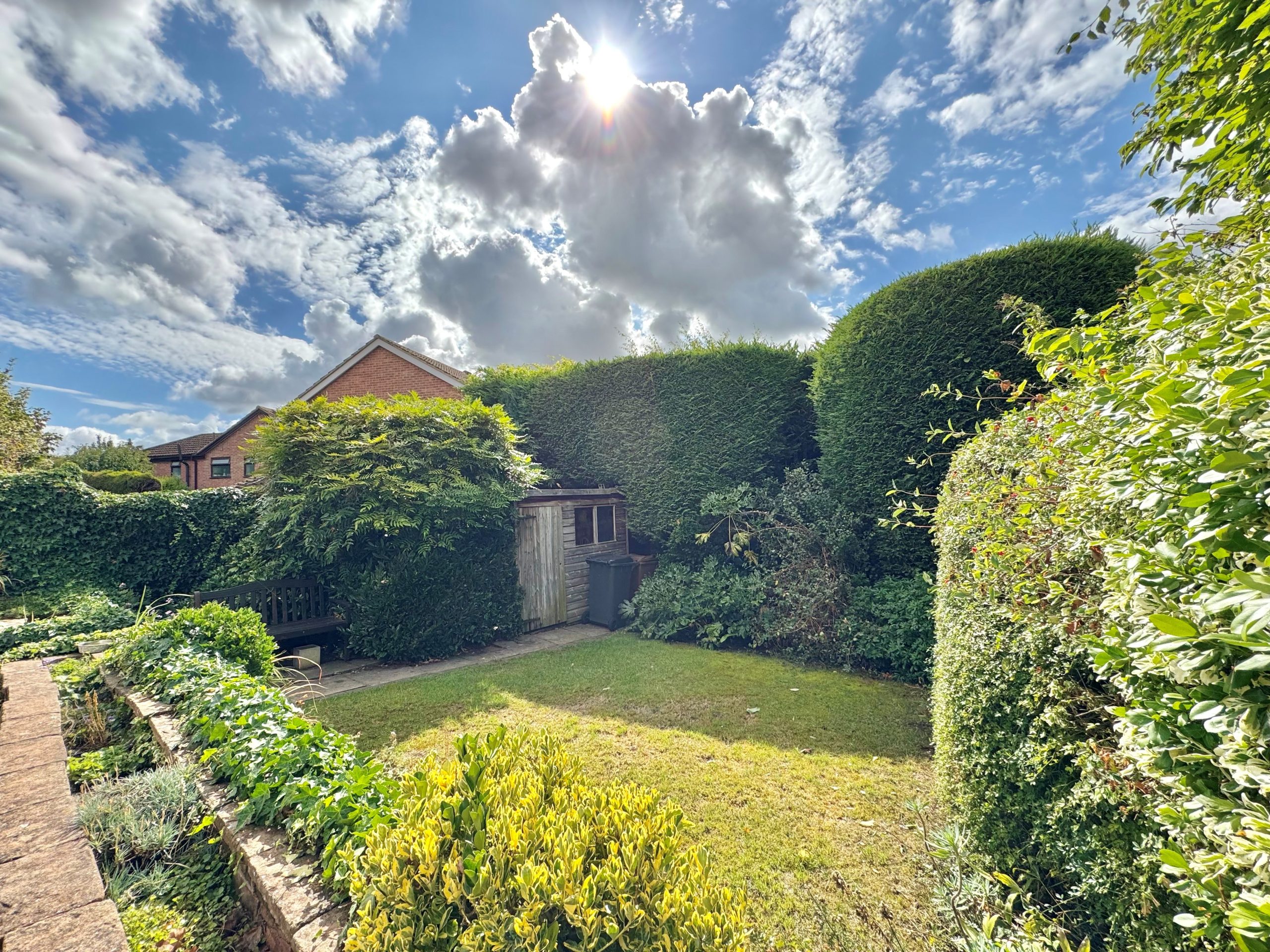 A well tended and established garden which has an extensive patio area with courtesy lighting, an outside tap and there is double gated access with block paving and steps which leads down to a lawn area with flowers, shrubs, hedging, trees and a wooden shed, all mainly enclosed by panelled fencing.