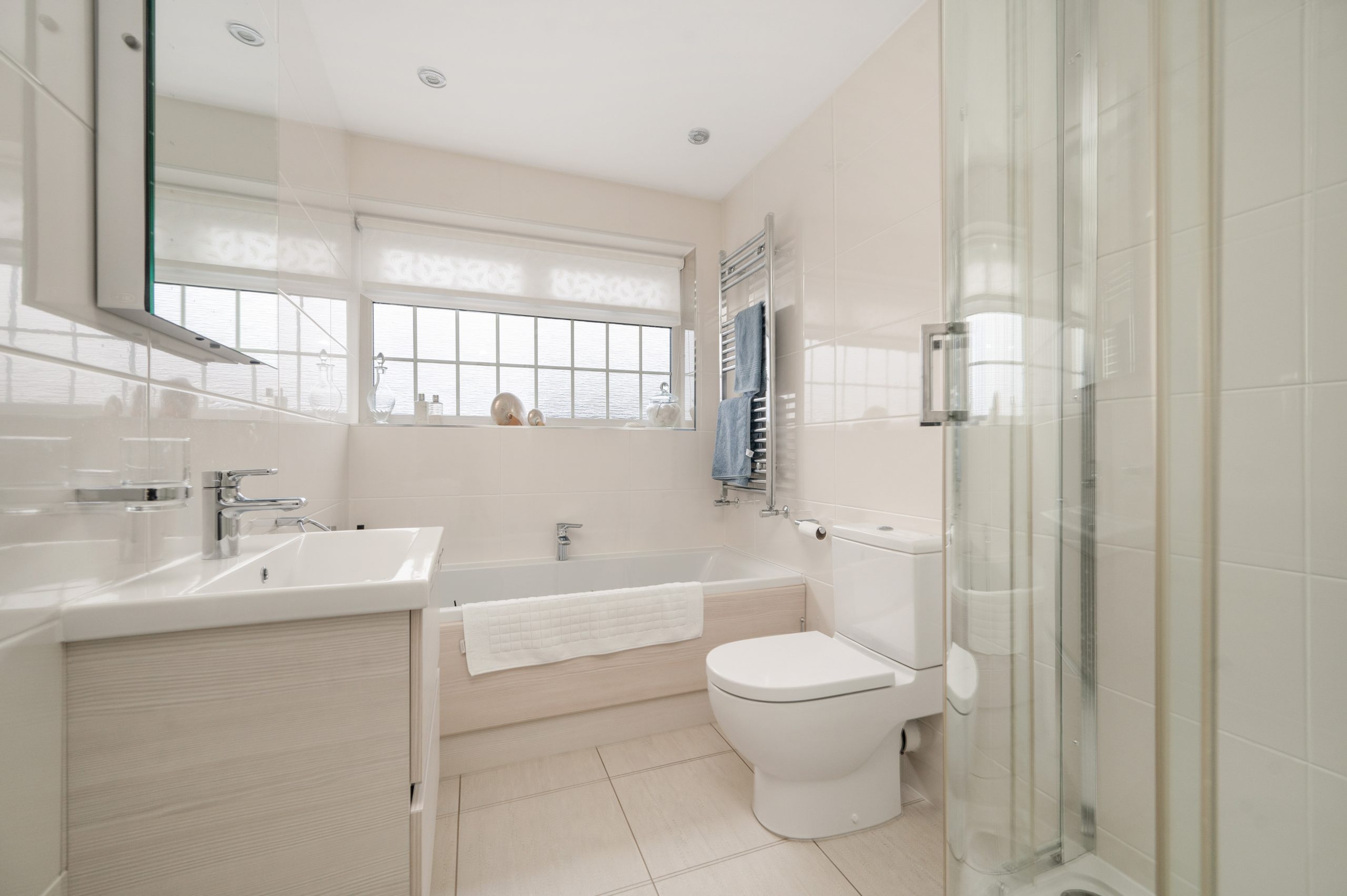 Frosted window to front and a white suite to comprise: Low flush WC, panelled bath, independent shower cubicle and a vanity unit wash hand basin with a fitted mirror and light, fully tiled walls, tiled floor, heated towel rail and ceiling down lights.