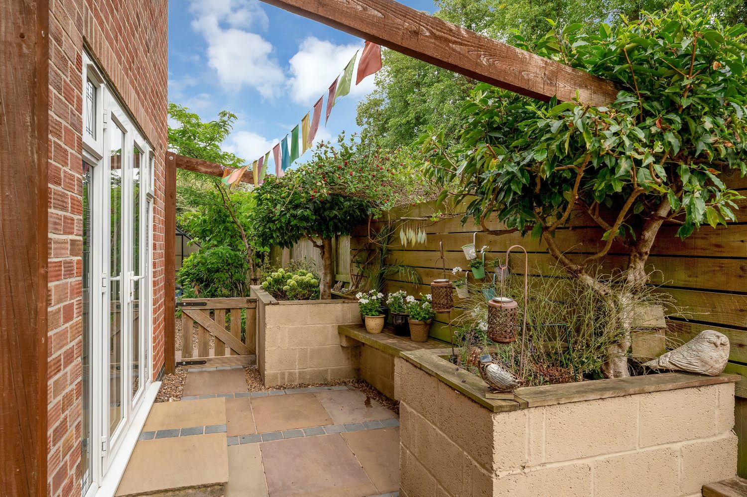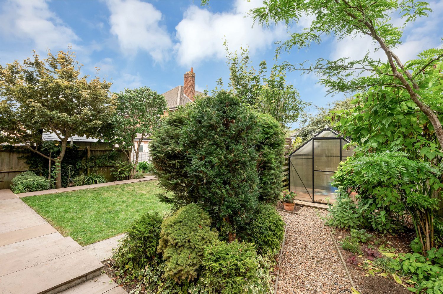 A well tended and established garden which has a lawn area with well stocked flowers, shrubs, hedging and part shingled borders, a green house, an outside tap, access to the garage and to one side of the property is an enclosed south facing patio area with a pergola and raised beds, all mainly enclosed by panelled fencing.