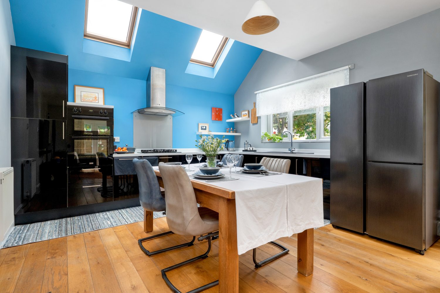 An impressive open plan and triple aspect room which has a partially vaulted ceiling with two velux ceiling windows, ceiling down lights, glazed french doors with side windows to a patio area and glazed french doors with side windows to the rear garden. There is a double sided log burner and a range of fitted kitchen units with work surfaces and upstand, one and a half sink drainer unit, integrated double oven, grill and a five ring gas hob with a stainless steel extractor fan hood, integrated dish washer, space for an American style fridge freezer, and solid oak flooring.