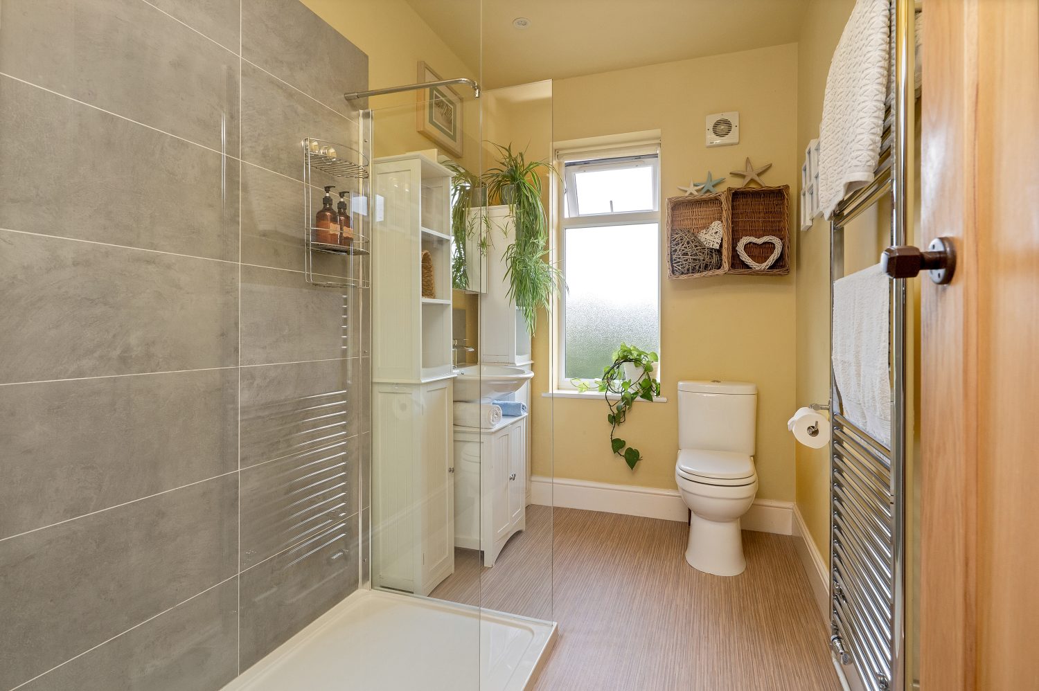 Obscurely glazed window to rear and a three piece suite comprising: Low flush WC, pedestal wash hand basin and a generously sized walk-in shower cubicle, tiled splash backs, ceiling down lights, heated towel rail and an extractor fan.