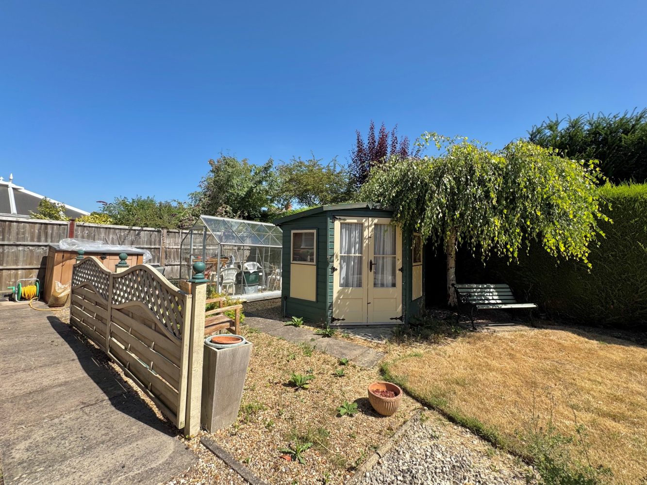 Also a well established garden which is mainly laid to lawn with a variety of flowers, shrubs, hedging and shingled boarders. There is a paved terrace to one corner of the garden and a patio area with an outside tap, courtesy lighting, a green house, a wooden shed, access to the garage and two side gated, all mainly enclosed by panelled fencing.