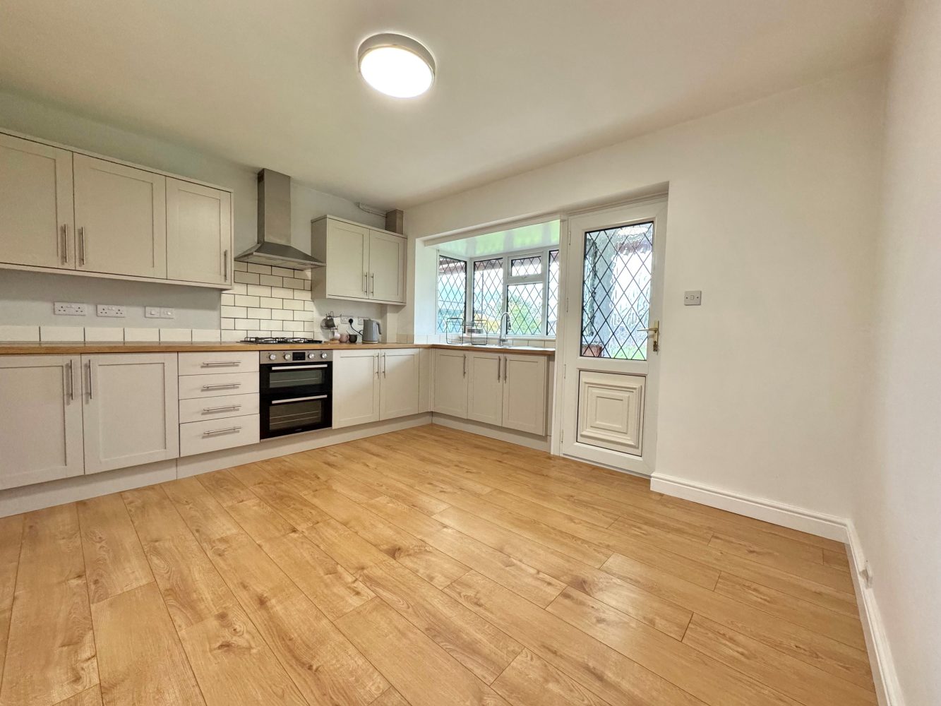 Bay window to rear and a range of eye and base level units with roll top work surfaces and tiled splash backs, there is a sink drainer unit, integrated oven, grill and a gas hob with a stainless steel extractor fan hood, space for a fridge freezer and a part glazed door to:
