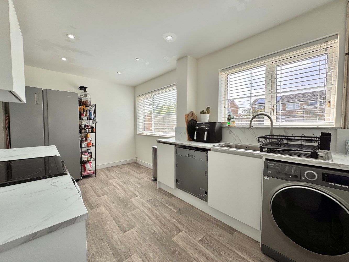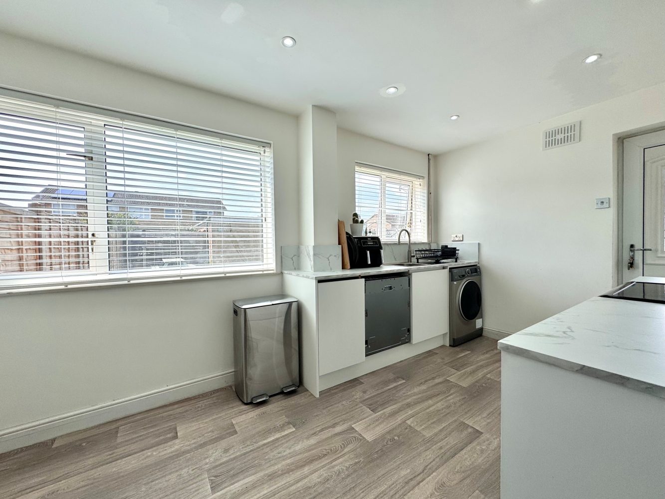 A lovely light room with two windows to rear and a part glazed door to side. There is a range of eye and base level units with roll top work surfaces, sink drainer unit, gas and electric cooker points, plumbing for a washing machine and a dish washer, space for a fridge freezer and there are ceiling down lights.