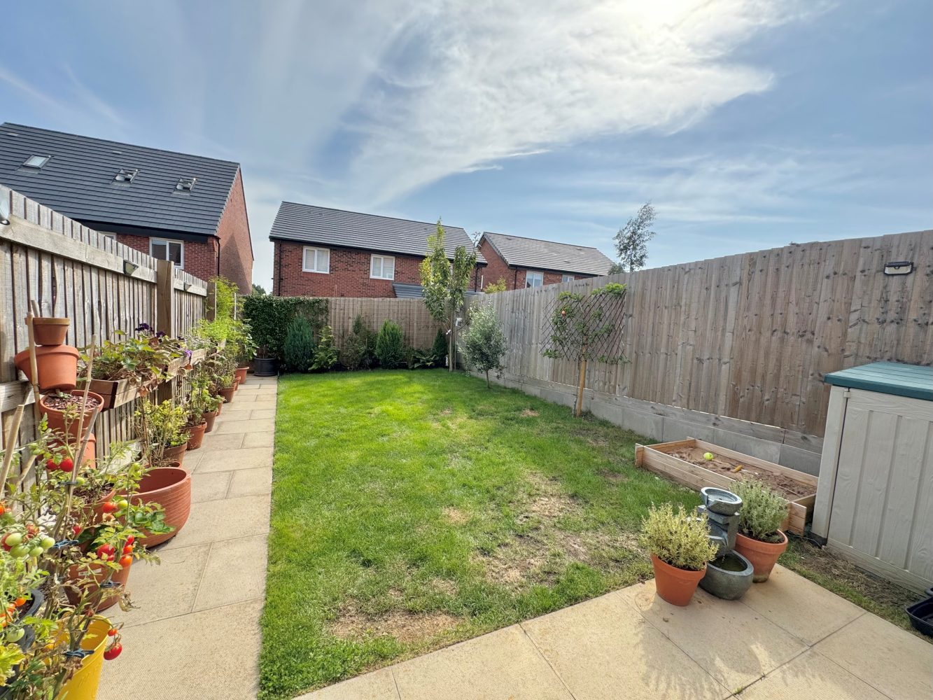 A well tended garden which is mainly laid to lawn with shrubs, a patio area, side gated access and mainly enclosed by panelled fencing.