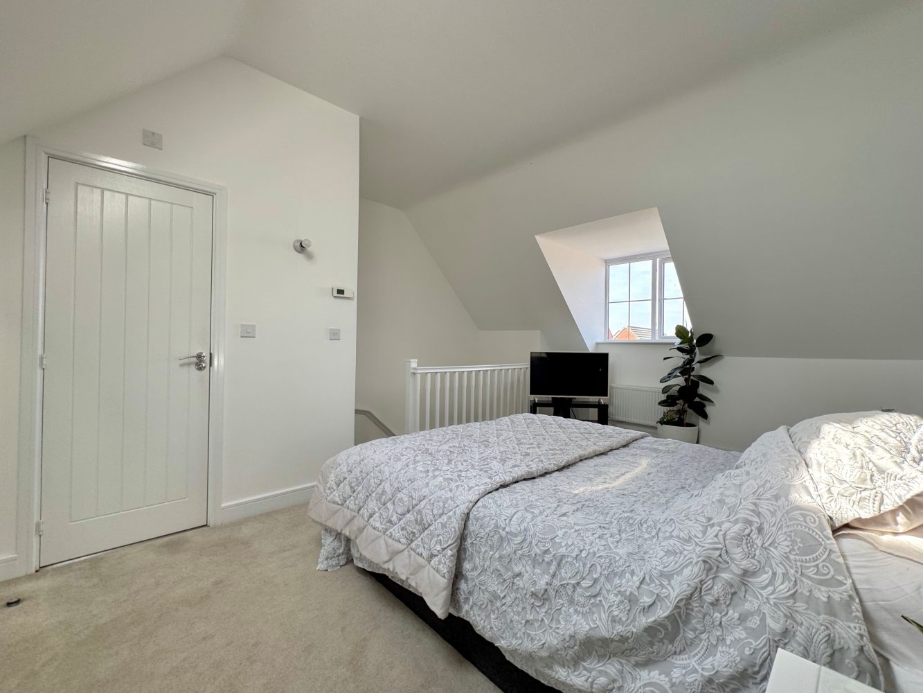 A generous and dual aspect double bedroom with a walk-in dormer window to front, velux ceiling window to rear and a range of fitted wardrobes along one wall, door to: