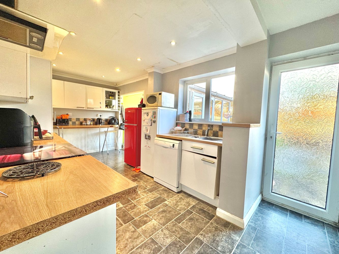 Window and a part glazed door to rear, doors to WC, garage and an archway to the conservatory. There are ceiling down lights and a range of eye and base level units with a breakfast bar, roll top work surfaces and tiled splash backs, one and a half sink drainer unit, gas cooker point with an extractor fan hood, plumbing for a dish washer, space for a fridge freezer, access to: