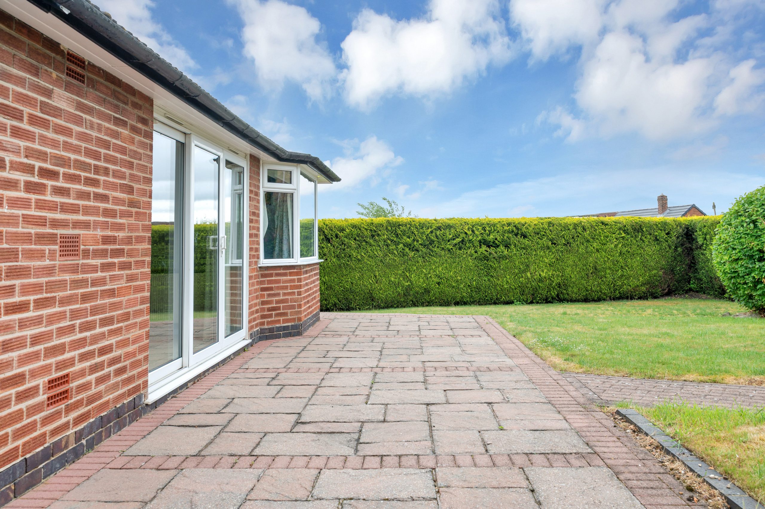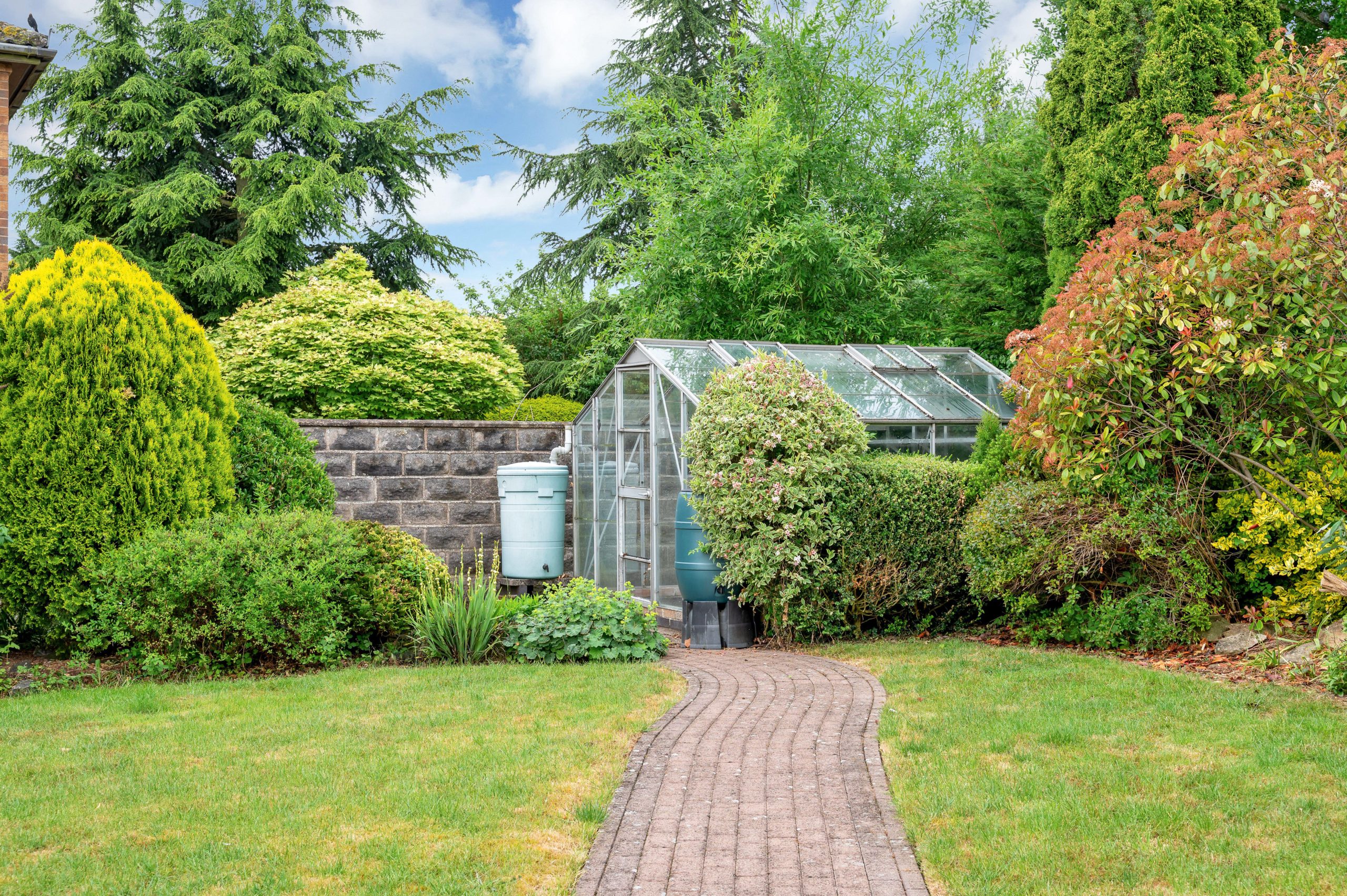 A well established and well tended garden which is mainly laid to lawn with a variety of well stocked flowers, shrubs and hedging, there is a greenhouse and there is an extensive patio area with a tap and courtesy lighting.