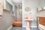 Frosted window to side and a four piece suite to comprise: Low flush WC, pedestal wash hand basin, panelled bath and an independent shower and tray, tiled splash backs and a heated towel rail.