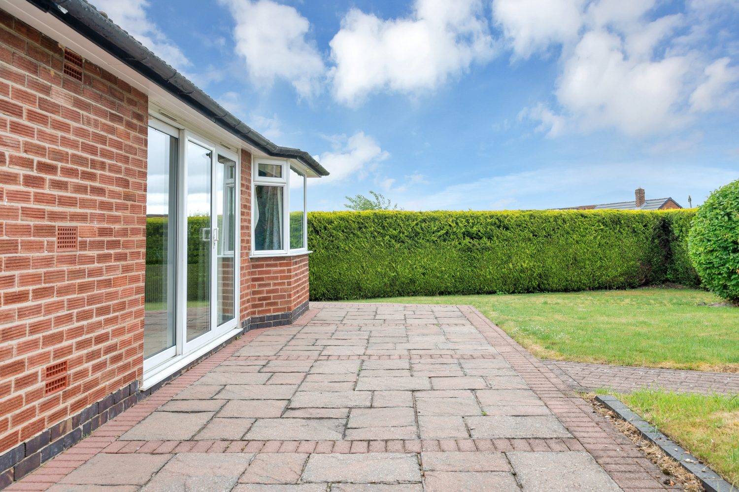 A block paved drive for several cars and which has mature shrubs and hedging, partially enclosed by a dwarf wall and there is access to both sides of the property.
