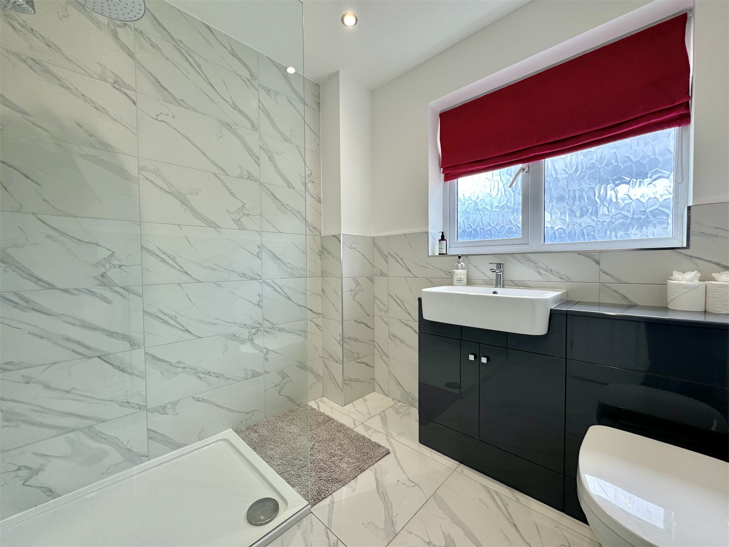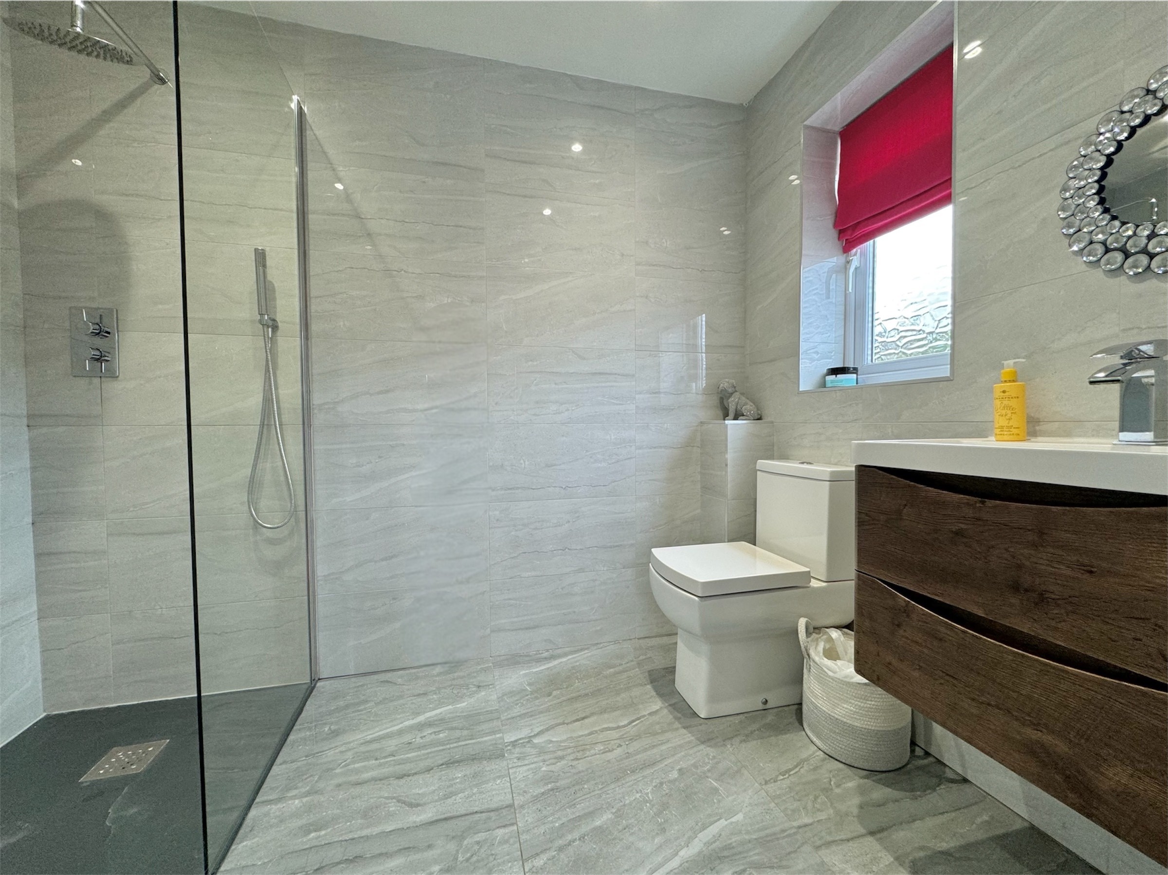 Frosted window to side and a white suite to comprise: Low flush WC, vanity unit wash hand basin with drawers below and there is a walk-in double shower cubicle, fully tiled walls, tiled floor, ceiling down lights, heated towel rail, extractor fan and shaver points.