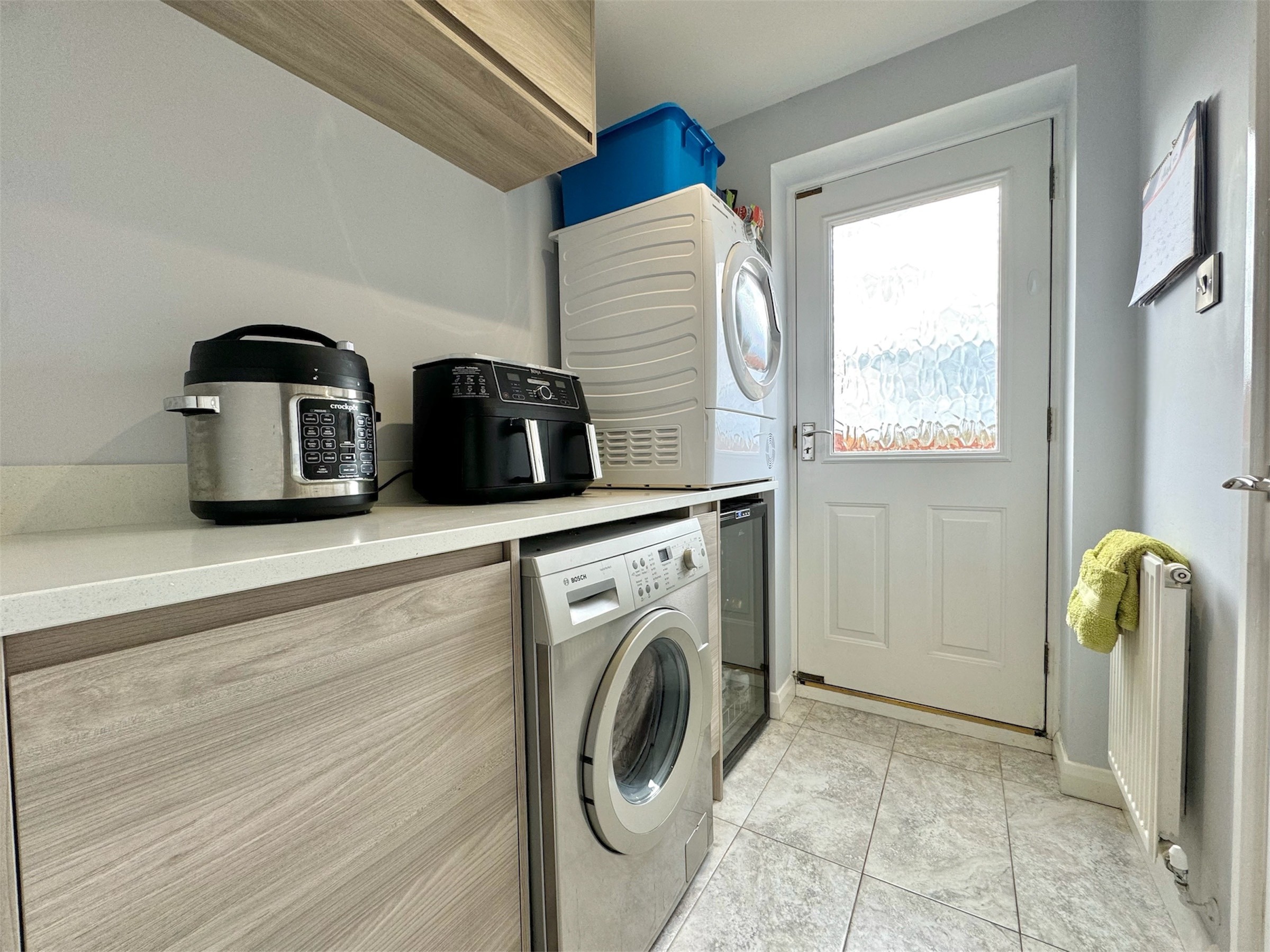 Part glazed door to rear and a range of eye and base level units with Quartz work surfaces and splash backs, fitted Bosch washing machine and a wine/beer fridge included, space for a tumble dryer, ceiling down lights and a tiled floor, door to: