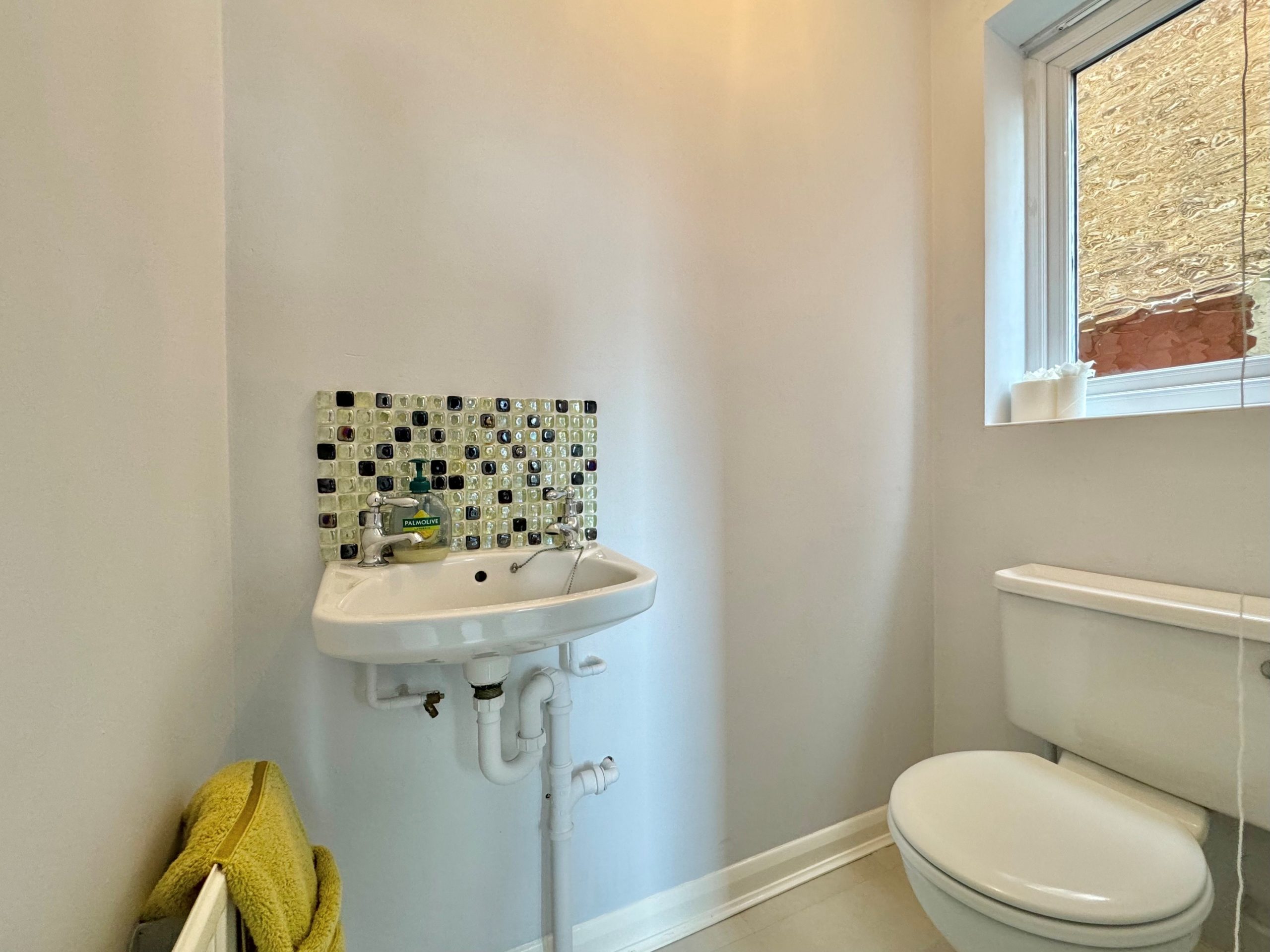 Frosted window to side and a white suite to comprise: Low flush WC and wash hand basin with tiled splash backs.