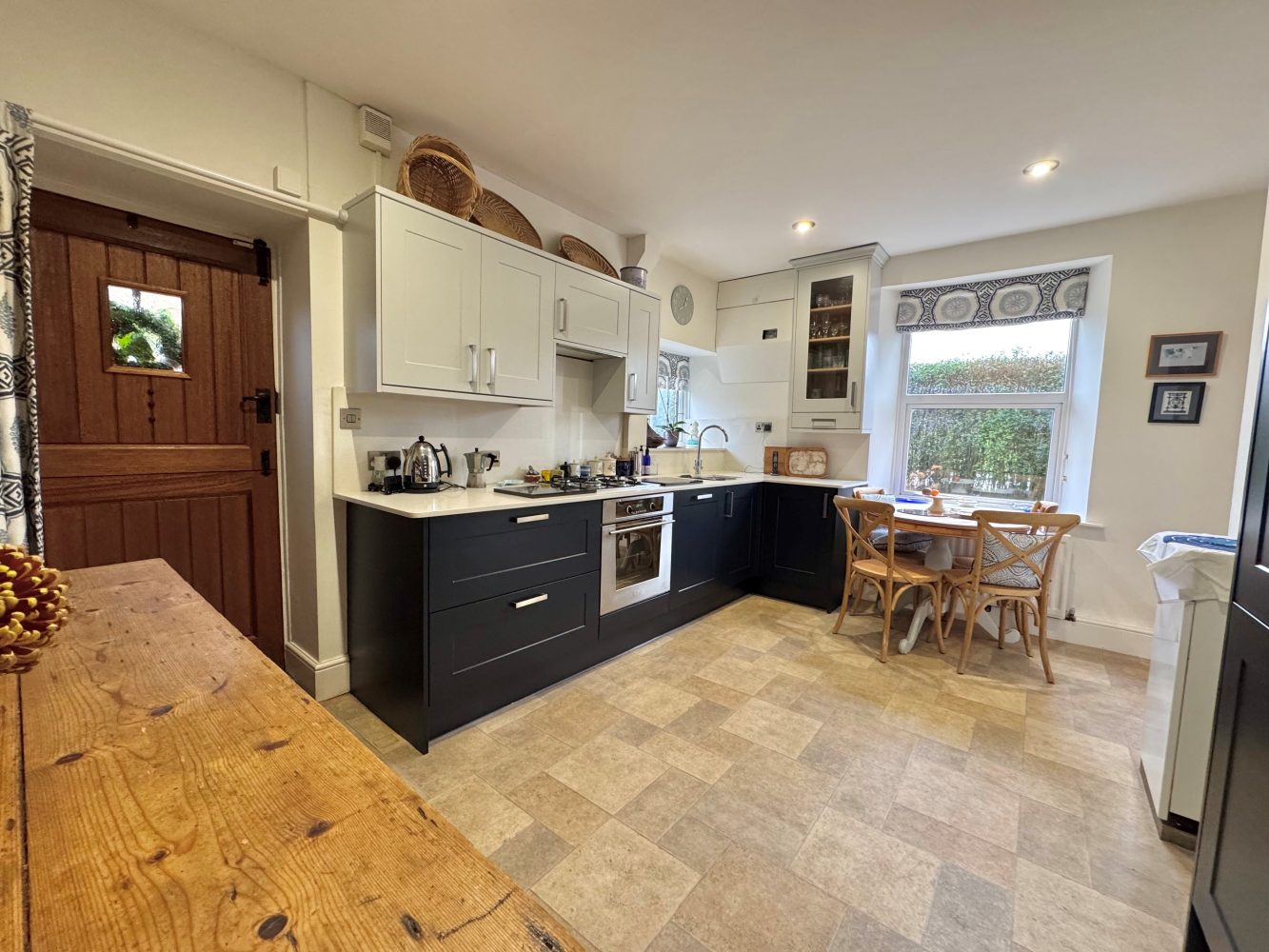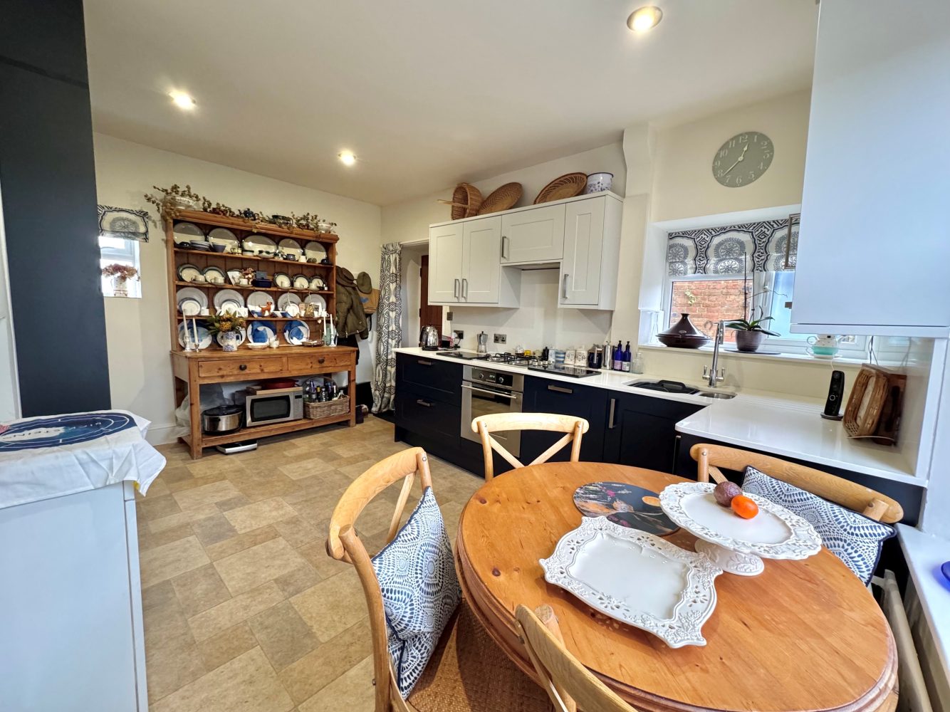 A triple aspect room with windows to the front and rear. A window and a part glazed stable door to the side, with ceiling down lights. There are a range of eye and base level units with quartz work surfaces, splash backs and drainer. Also included is a one and a half sink drainer unit, integrated oven, grill and a gas hob with an extractor fan hood, integrated dish washer, space for a fridge freezer, floor mounted boiler and a fitted meter/fuse cupboard.