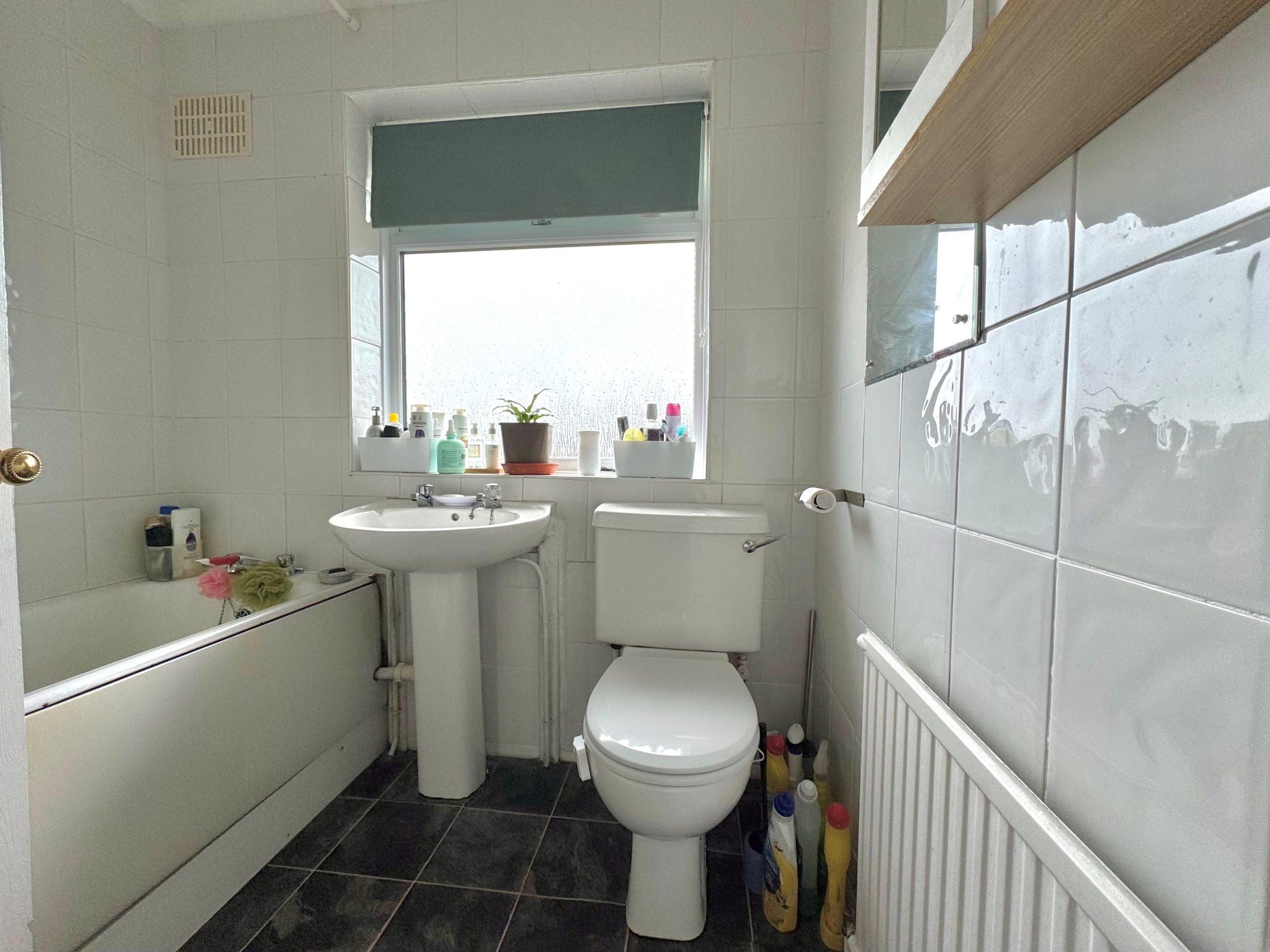 Frosted window to rear and a white suite to comprise: Low flush WC, pedestal wash hand basin and a panelled bath with an independent shower above, fully tiled walls and an extractor fan.