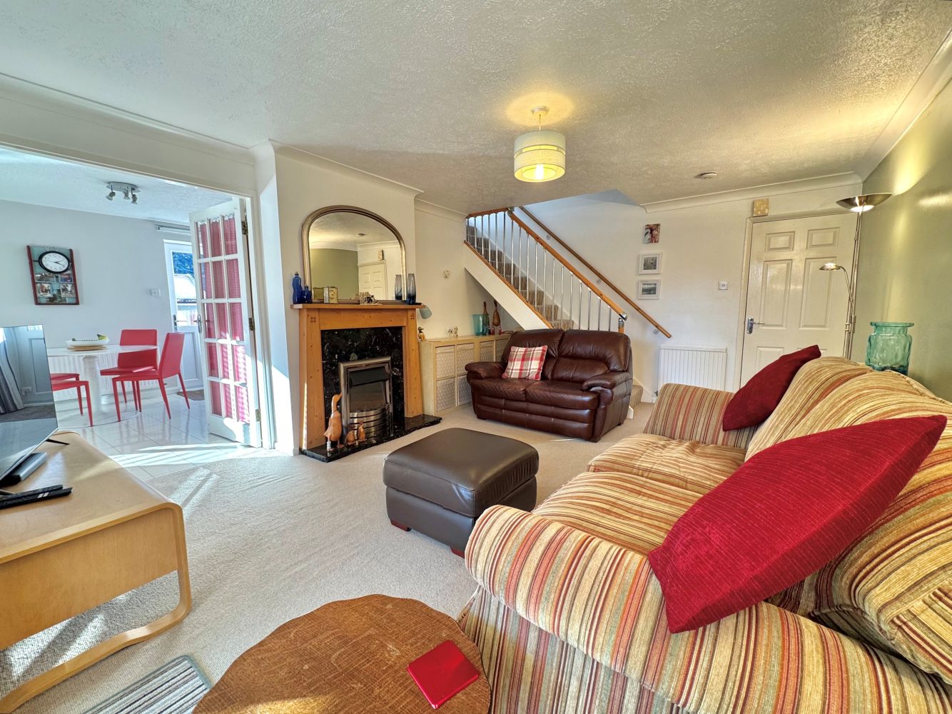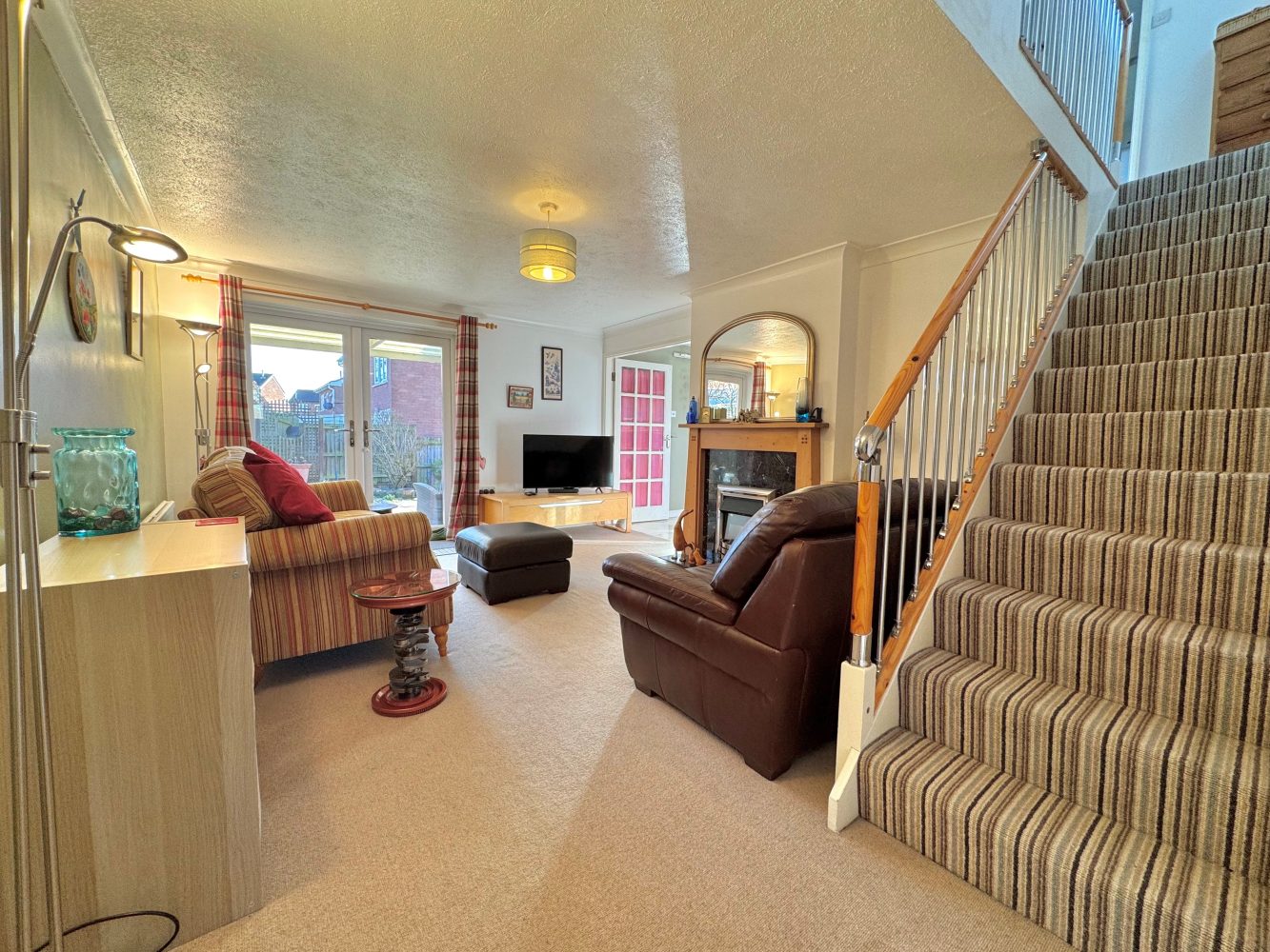A lovely room with glazed french doors to rear, a staircase leading up to the first floor landing and there is an electric coal effect fire with a mantel and hearth, glazed double doors to:
