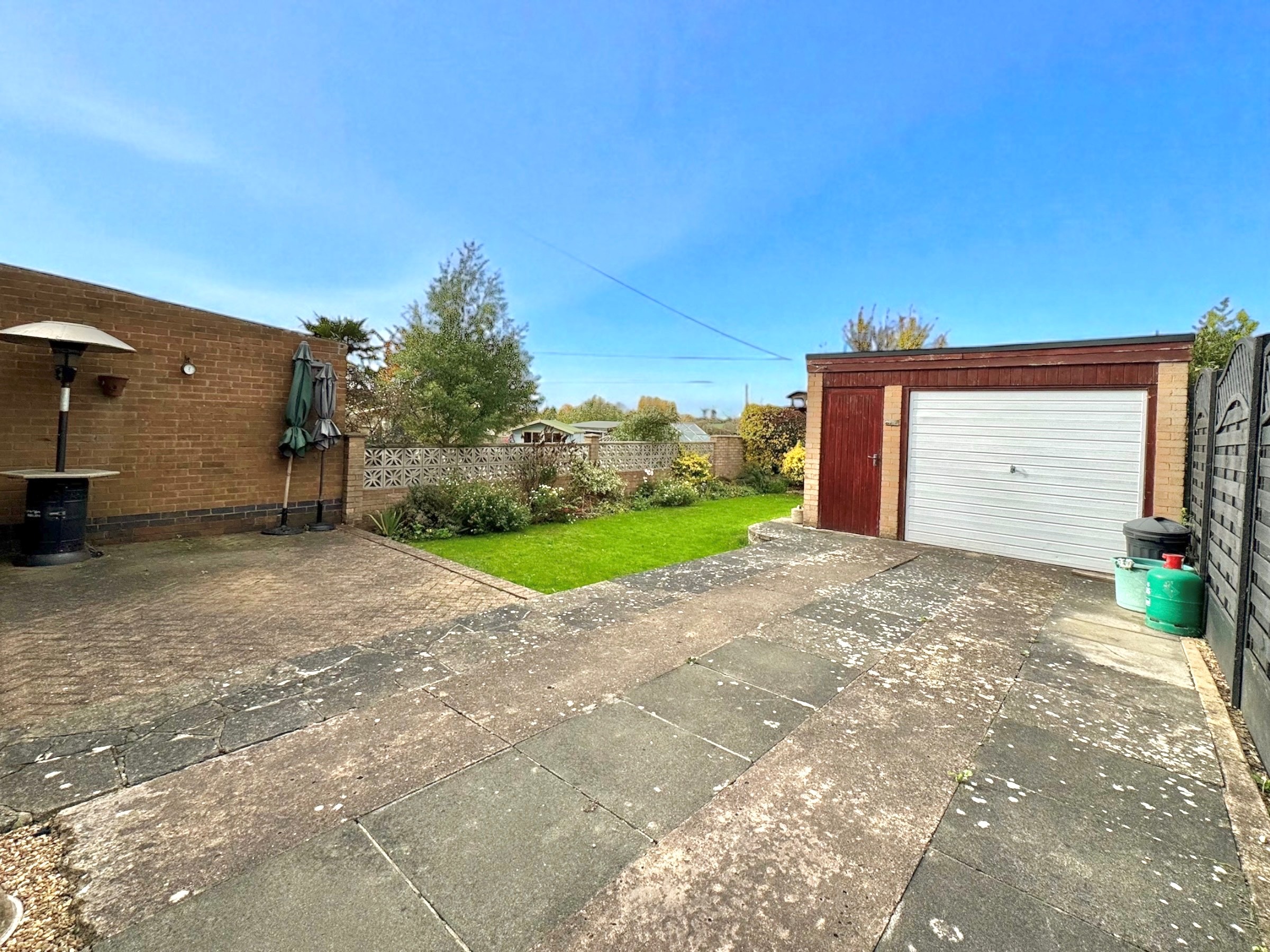 A well tended garden which backs onto allotments, the garden is mainly laid to lawn with flowers, shrub and hedging, there is an extensive and block paved patio area with courtesy lighting and an outside tap and a drive providing access to the garage and the garden is mainly enclosed by panelled fencing.