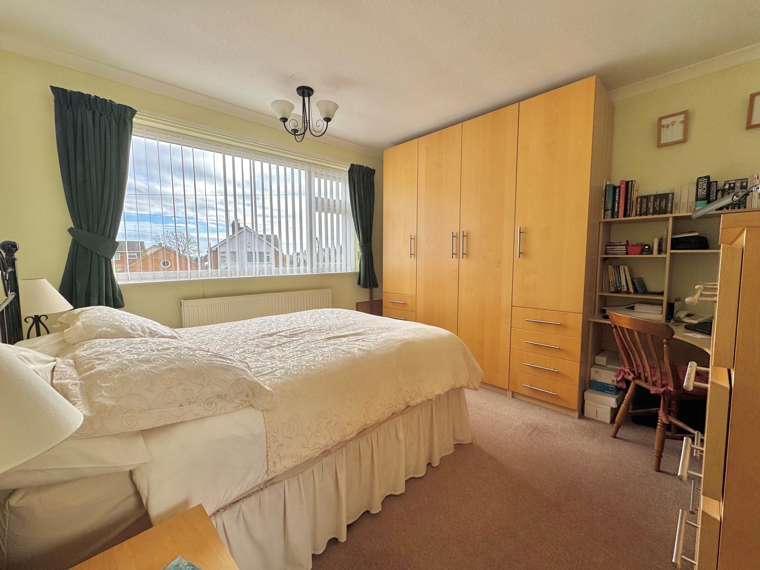 A generous sized double bedroom with a dressing area, a window to rear and a range of fitted wardrobes, cupboards, drawers and a dressing table along two walls and a fitted airing cupboard which houses the hot water cylinder.