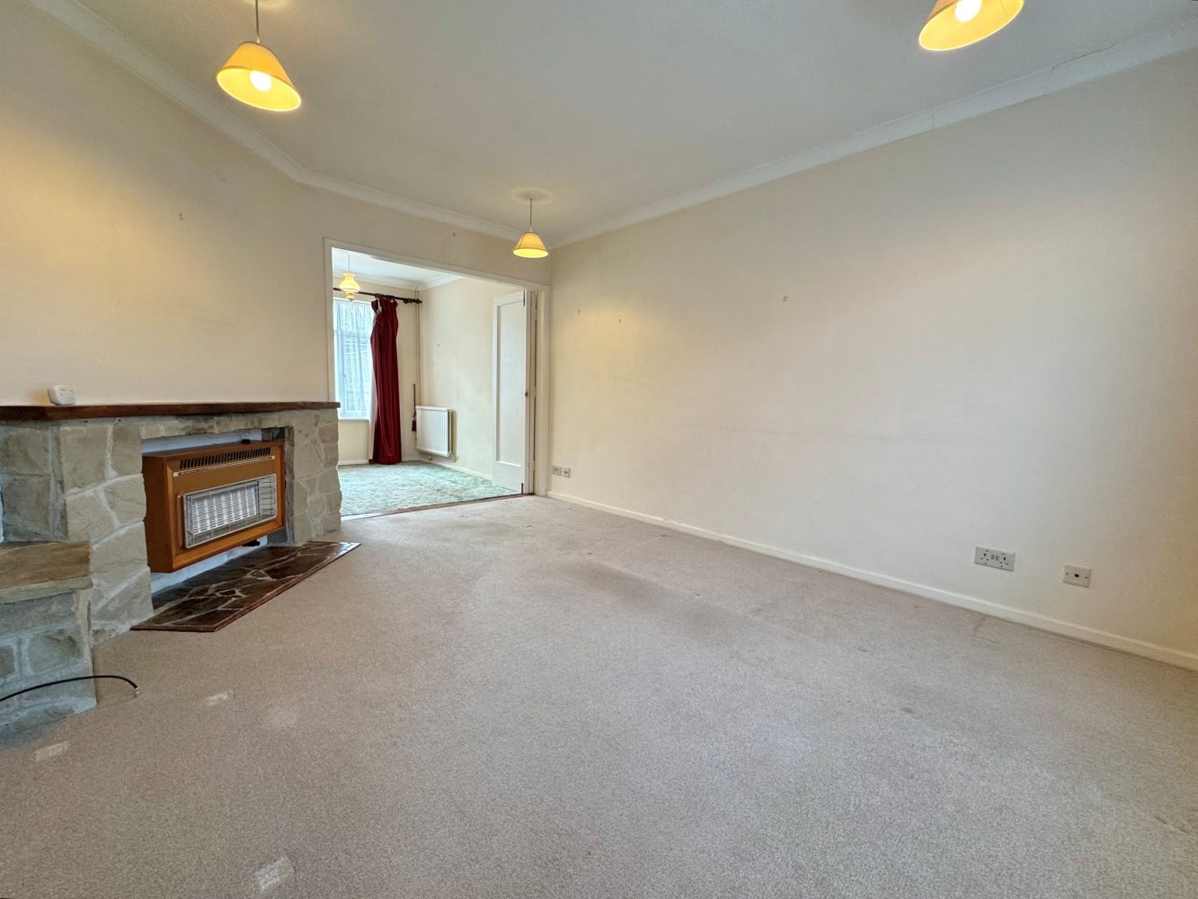 Window to front and a wall mounted gas fire with a stone hearth and mantel and there are bi-folding doors to: