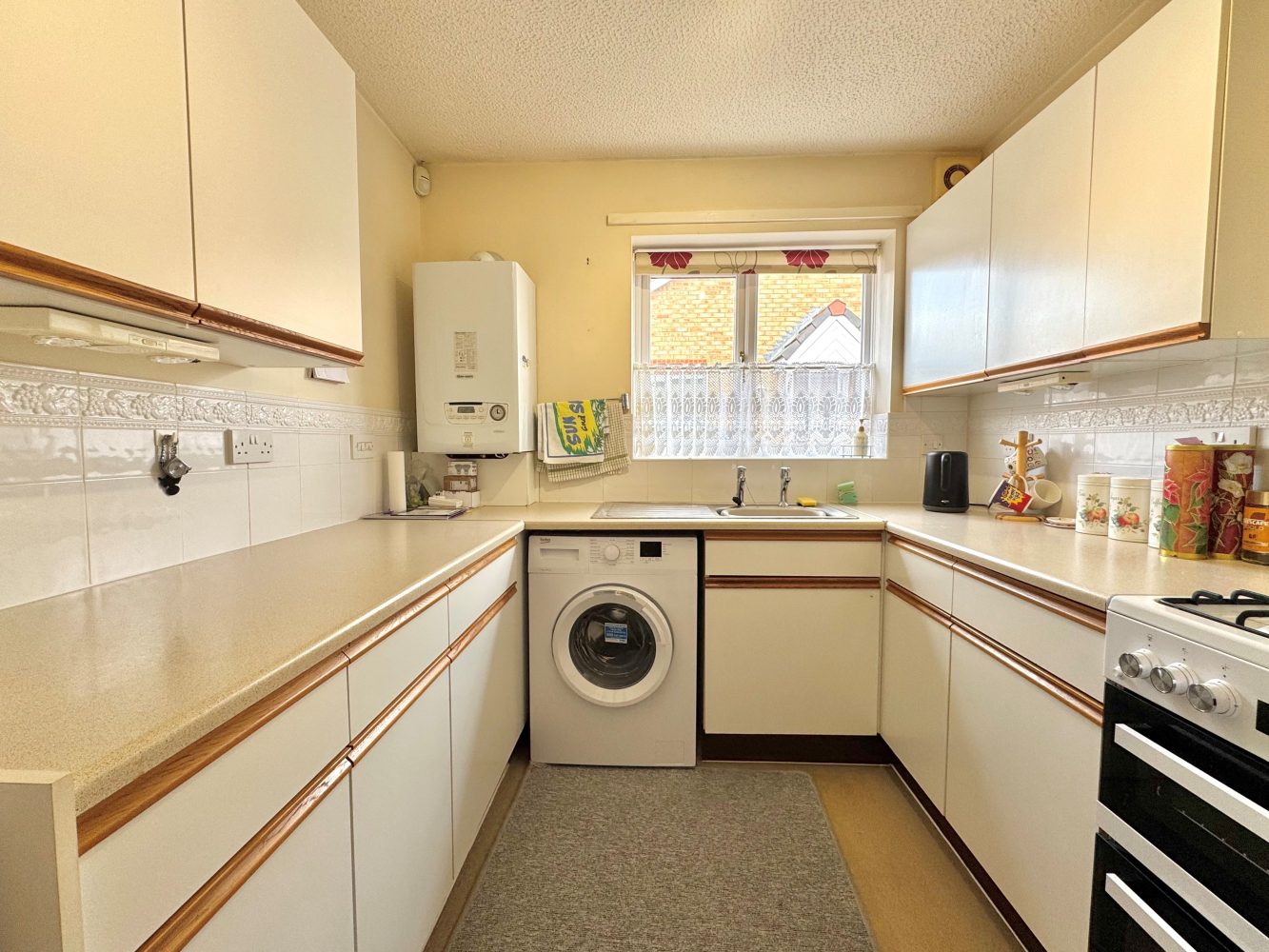 Window to side and a range of eye and base level units with roll top work surfaces and tiled splash backs. There is a sink drainer unit, gas cooker point, plumbing for a washing machine and space for a fridge freezer.