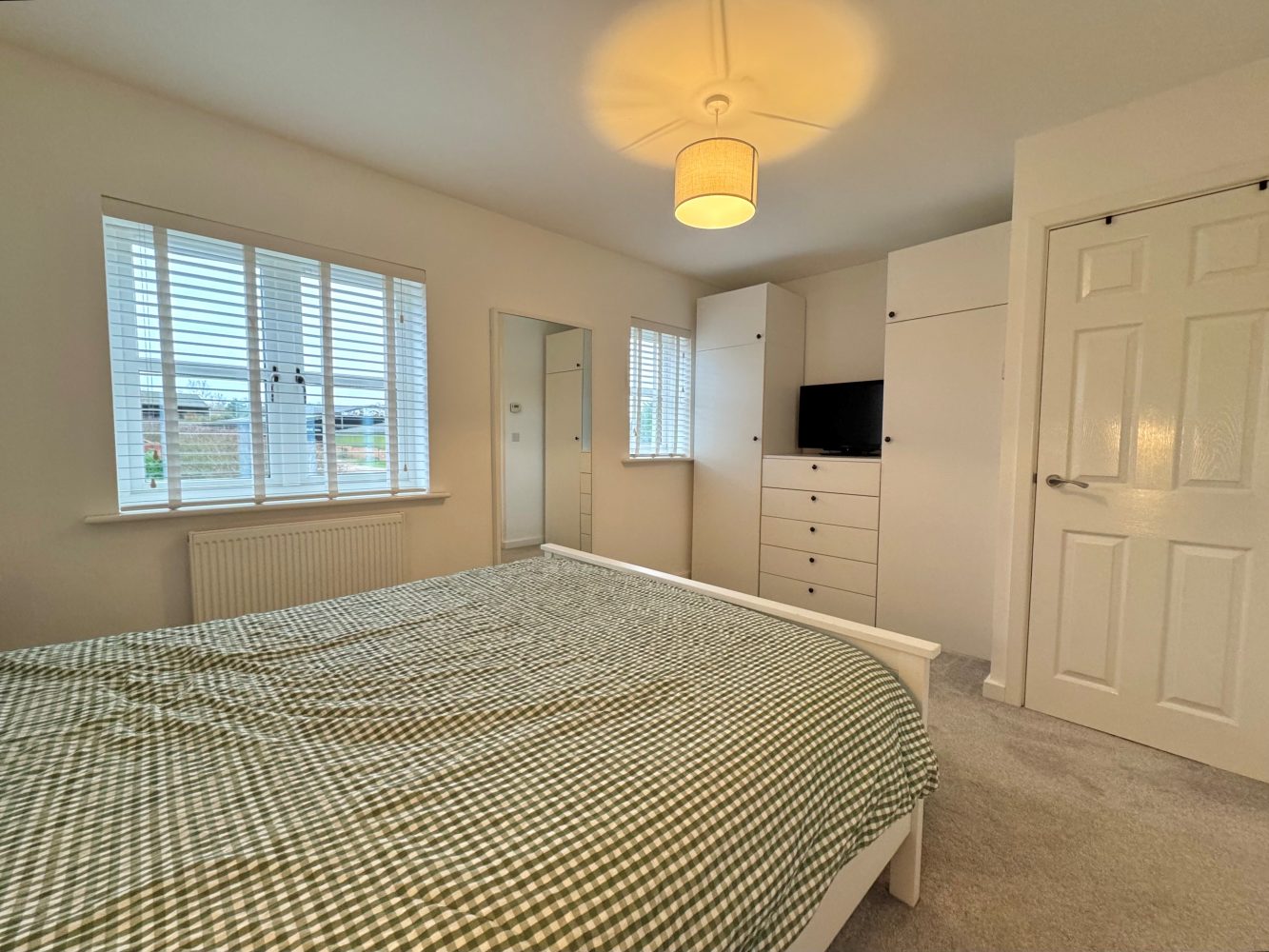 A double bedroom with two windows to front and a built-in cupboard.