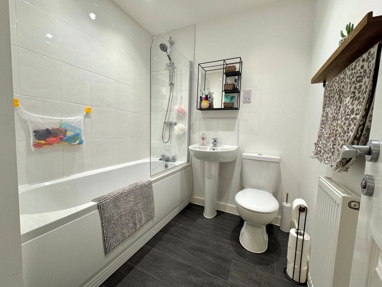 A white suite to comprise: Low flush WC, pedestal wash hand basin and a panelled bath with an independent shower and screen above, tiled splash backs, shaver points, extractor fan and ceiling down lights.