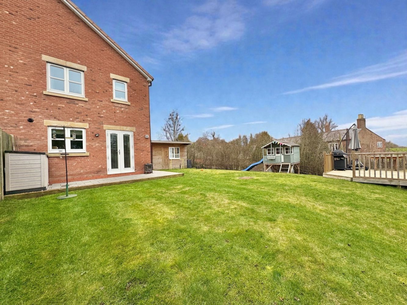 A generous sized garden which is mainly laid to lawn with an extensive decked area, there is a patio area with an outside tap, courtesy lighting, power sockets and there is space for a wooden shed and the garden is enclosed by panelled fencing and hedging.