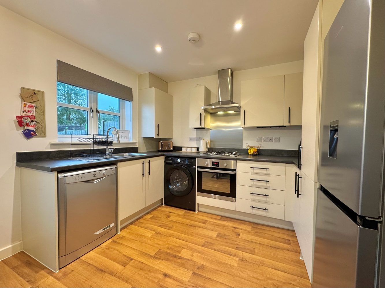 Well tended and mainly laid to lawn with a block paved drive for two cars which benefits from courtesy lighting and there is a storm porch with courtesy lighting, an electric car charger and side gated access to: