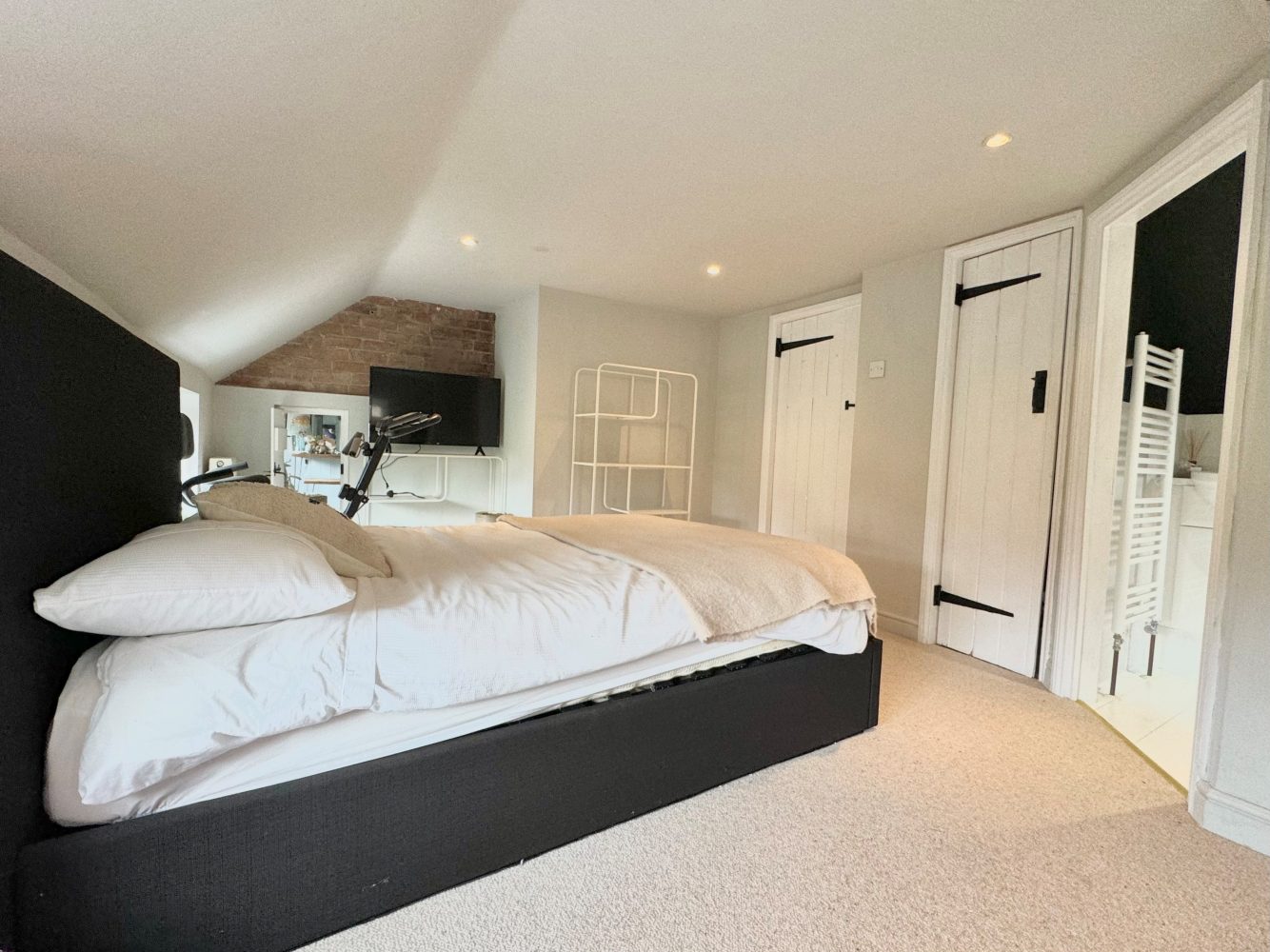 A generous sized double bedroom with a window to front, fitted wardrobes and cupboards along one wall and a panelled dwarf door to bedroom one.