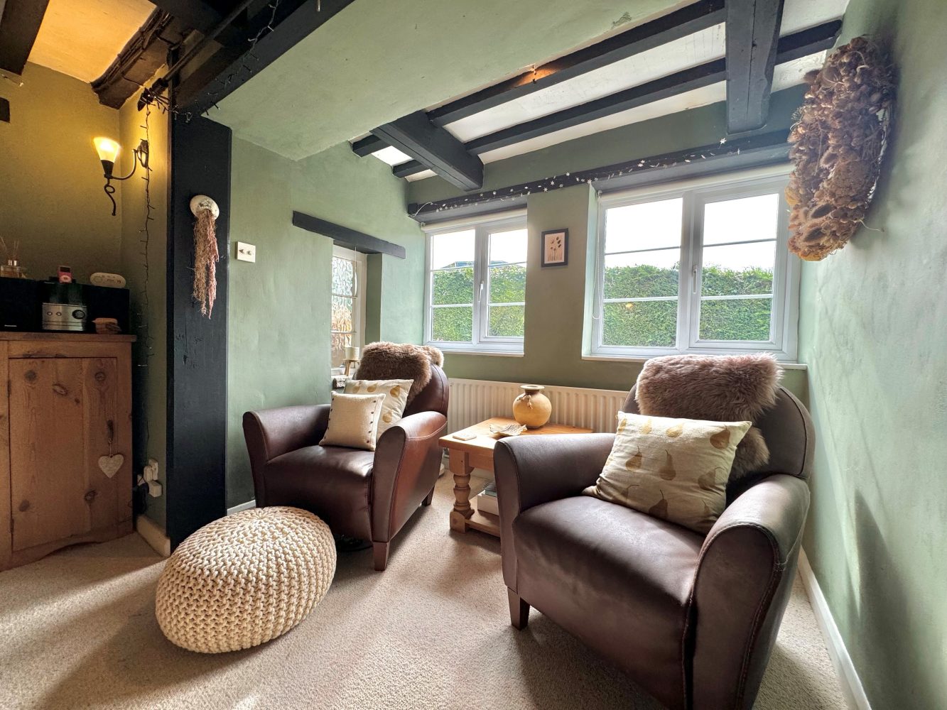 A charming room with two windows to front, exposed ceiling and wall beams, staircase leading up to the first floor landing with an under stairs cupboard and a brick built open fireplace and a panelled door to:
