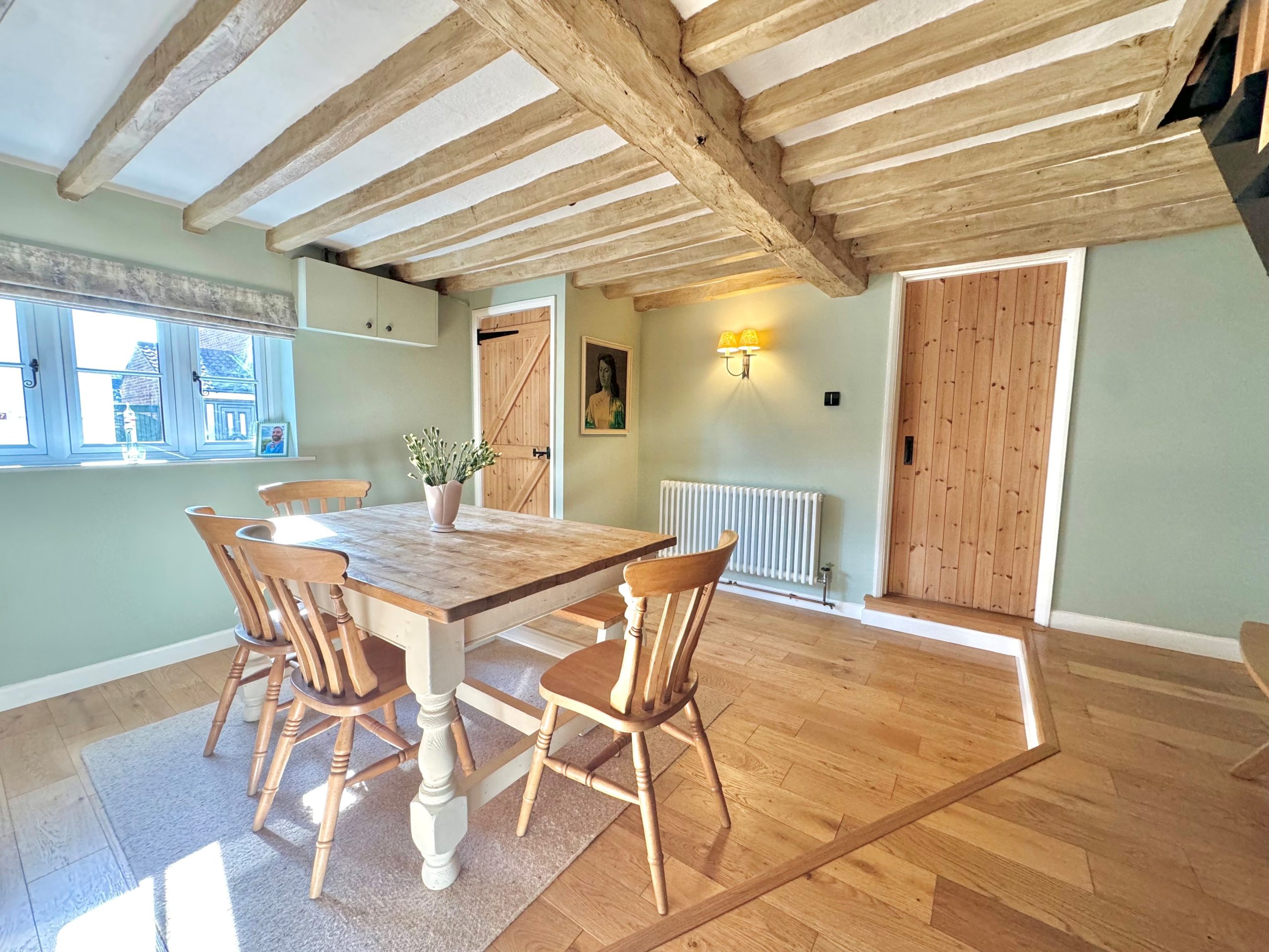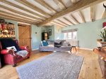 A lovely dual aspect room which has a window to front, glazed french doors to the rear garden, exposed ceiling beams, engineered oak flooring, a multi-fuel log burner with a brick built surround and a range of fitted cupboards along one wall.