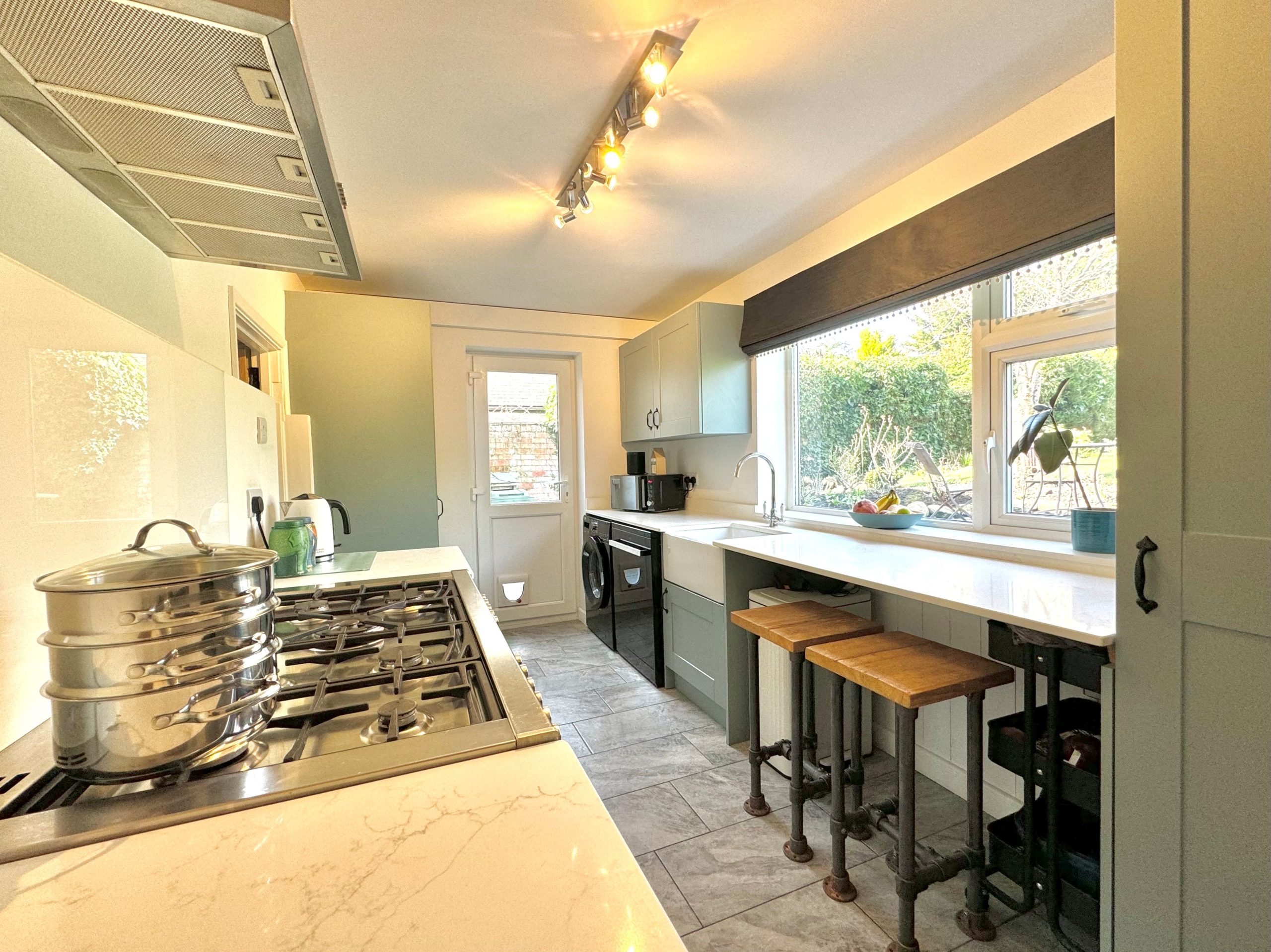 There is a window to rear, a part glazed door to the rear garden and a range of eye and base level units with a breakfast bar, quartz work surface and splash backs, 'Belfast' sink, space for a range cooker with a stainless steel extractor fan hood, plumbing for a washing machine and a dish washer, space for a fridge freezer and there is a tiled floor.
