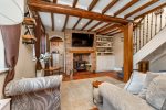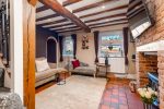 A lovely room with two windows to front, exposed ceiling beams with ceiling down lights, staircase leading up to the first floor landing, with an under stairs cupboard, fitted cupboards, tiled floor and a multi-fuel log burner with a brick built surround and a tiled hearth and a paneled door to: