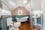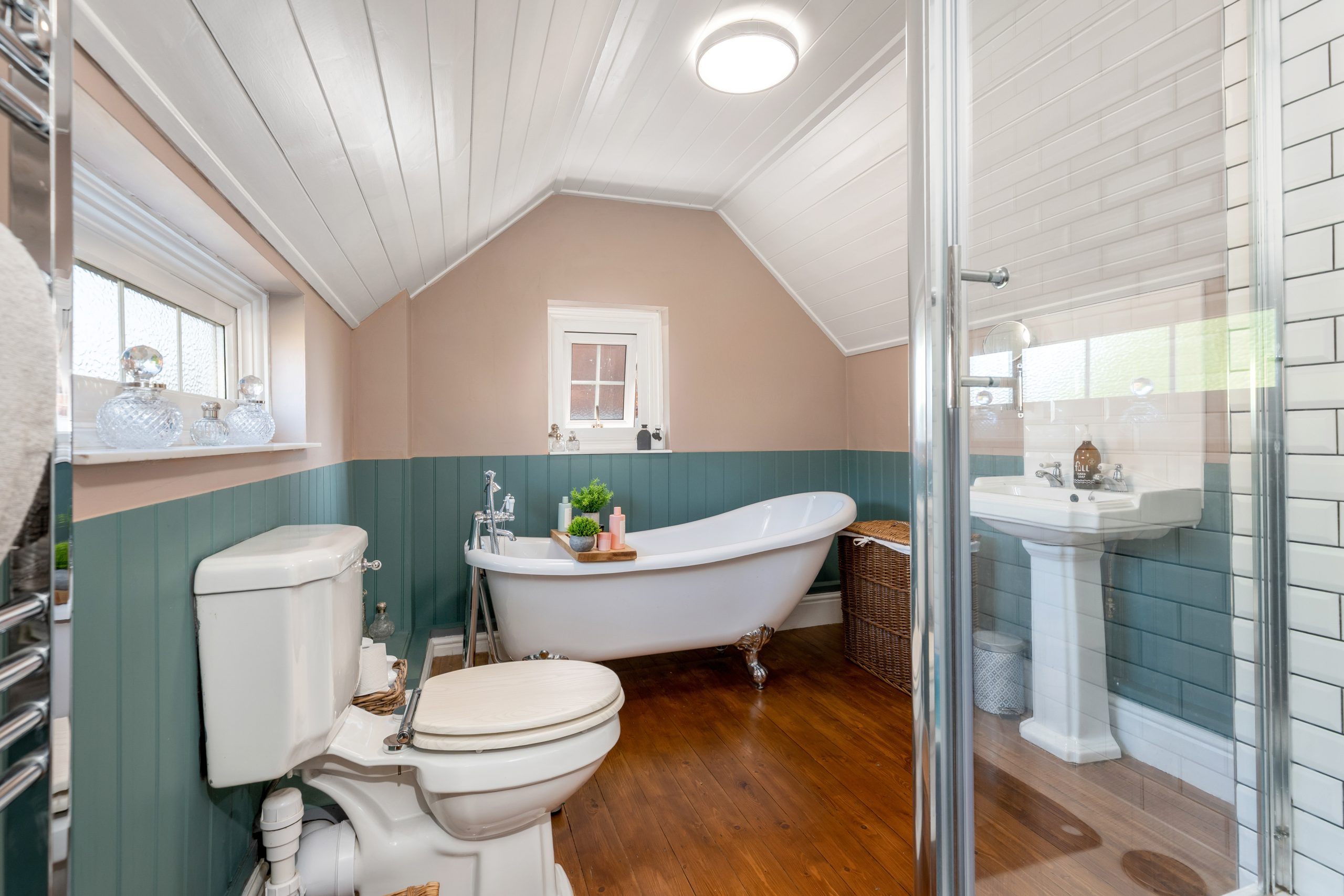 A dual aspect room which has frosted windows to front and side and a white four piece suite to comprise: Low flush WC, pedestal wash hand basin, independent shower cubicle with both a rain shower and hose and there is a stand alone claw bath with a telephone style shower attachment, tiled splash backs, exposed floor boards, heated towel rail, extractor fan and a fitted airing cupboard which houses the 'Worcester' boiler.