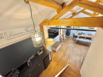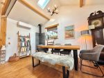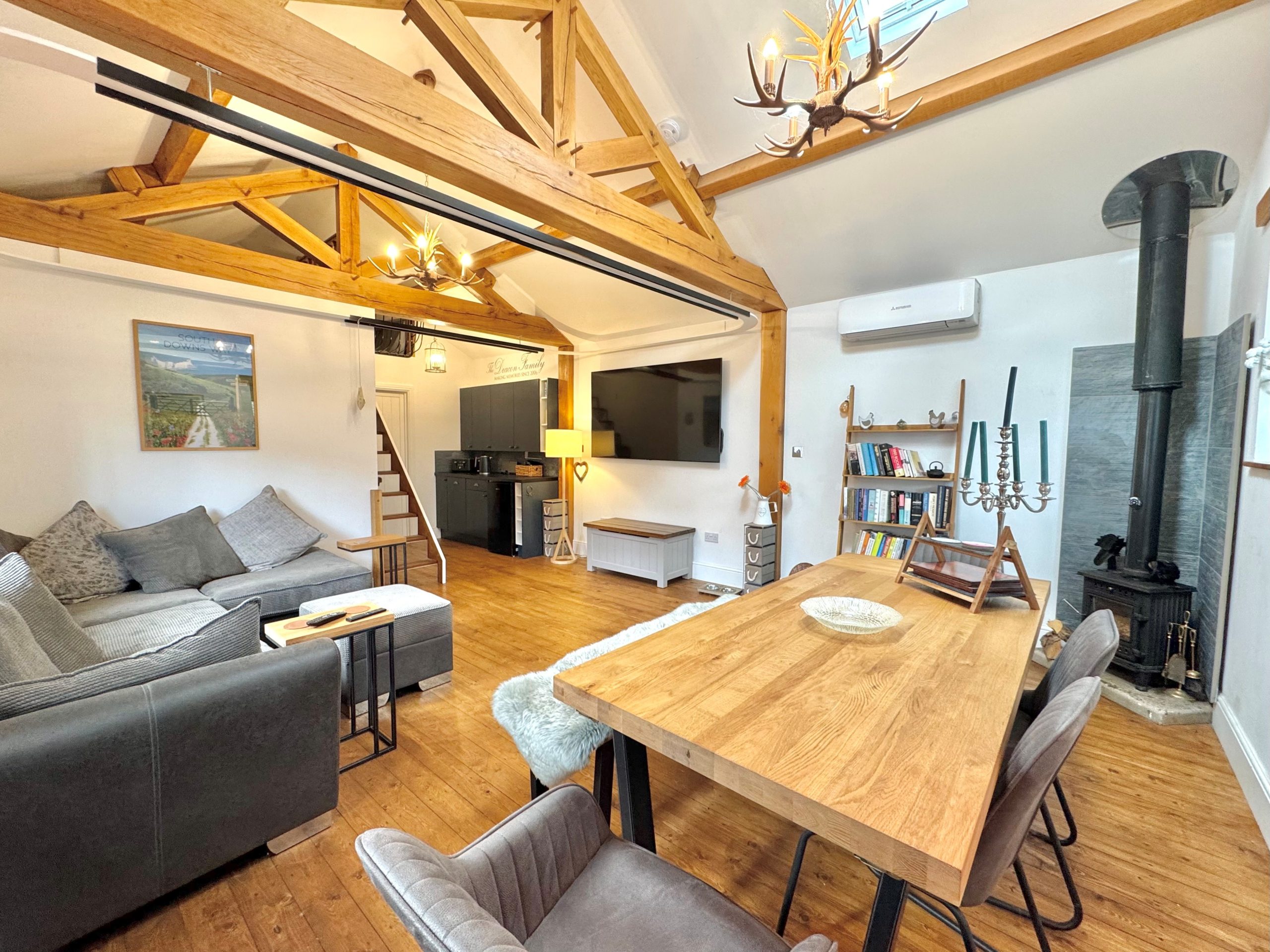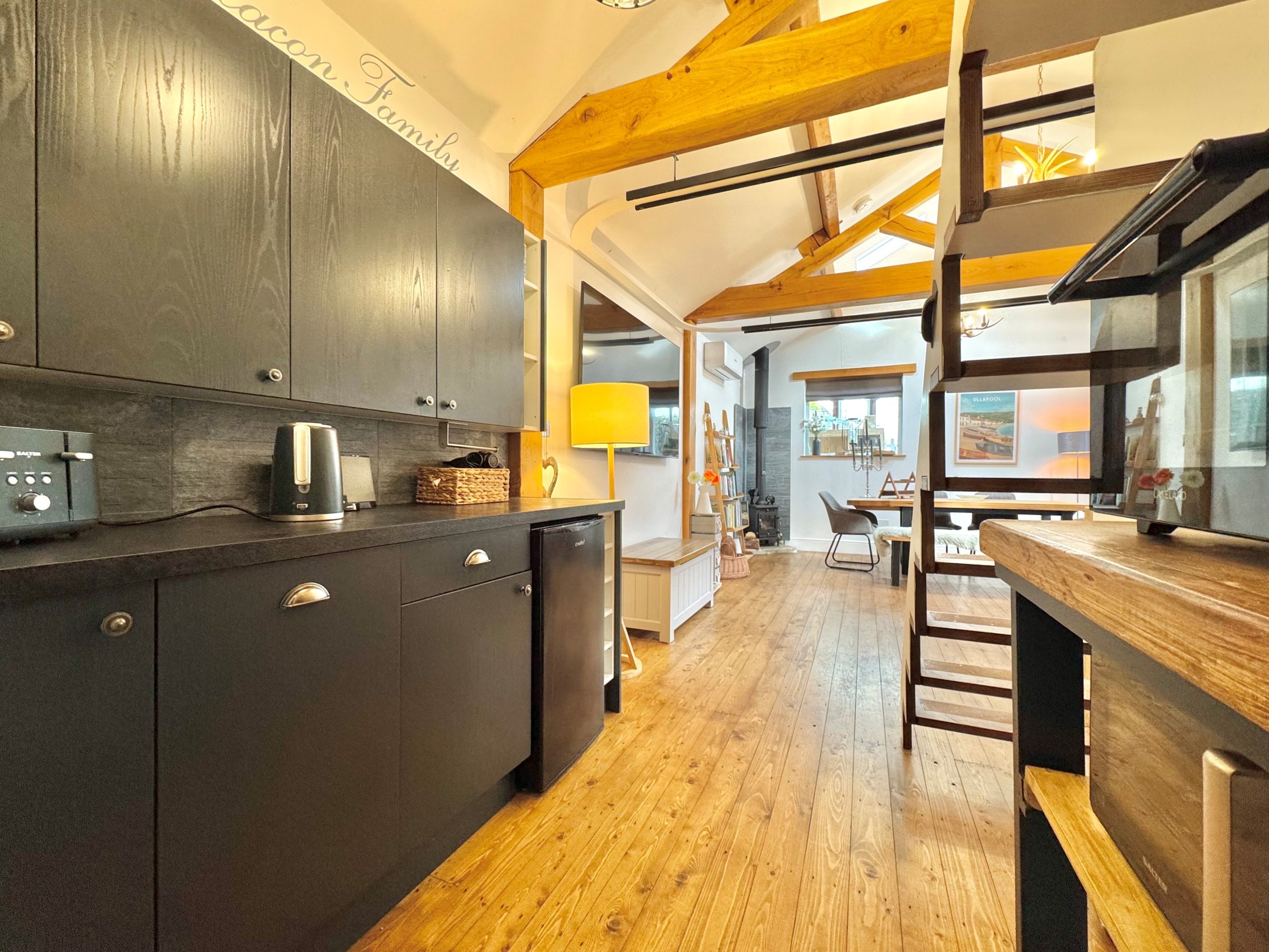 Entrance via a part glazed front door leading into this impressive triple aspect and open plan living space which has a vaulted beamed ceiling with two velux ceiling windows, window to front and to side. The lounge dining area with a multi-fuel log burner with a tiled hearth and a stone hearth, a wooden staircase which leads up to a mezzanine sleeping area and there are exposed floor boards The kitchenette area has a range of eye and base level units with roll top work surfaces, tiled splash backs, integrated dish washer and a door to: