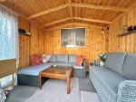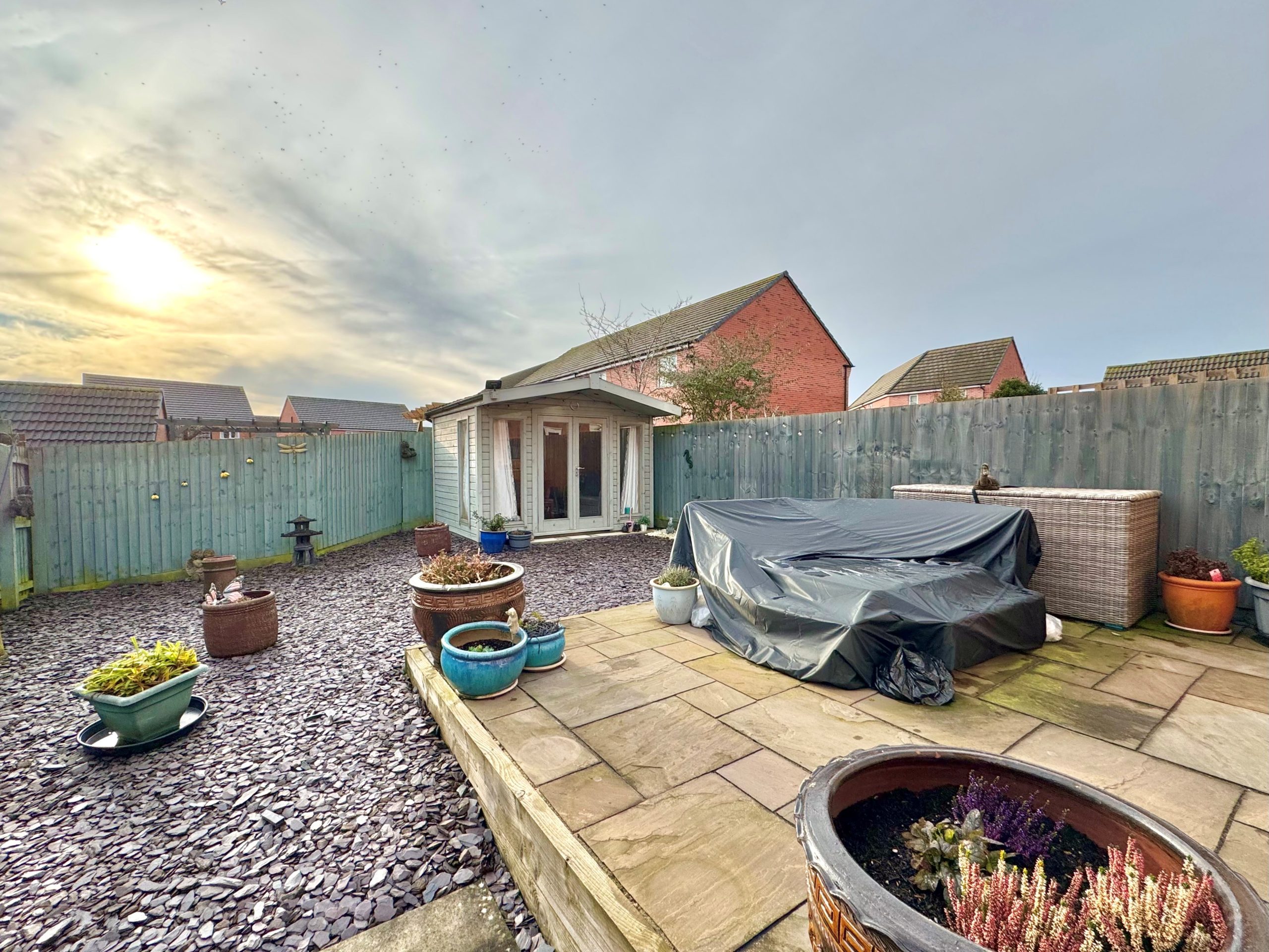 A well tended and low maintenance garden which is mainly shingled with a patio area benefitting from courtesy lighting, an outside tap and two power sockets, towards the end of the garden is a wooden summer house which measures 9'0 x 7'0" and has power and light connected and which has windows to both sides and glazed french doors with side windows to front and the garden is mainly enclosed by panelled fencing.